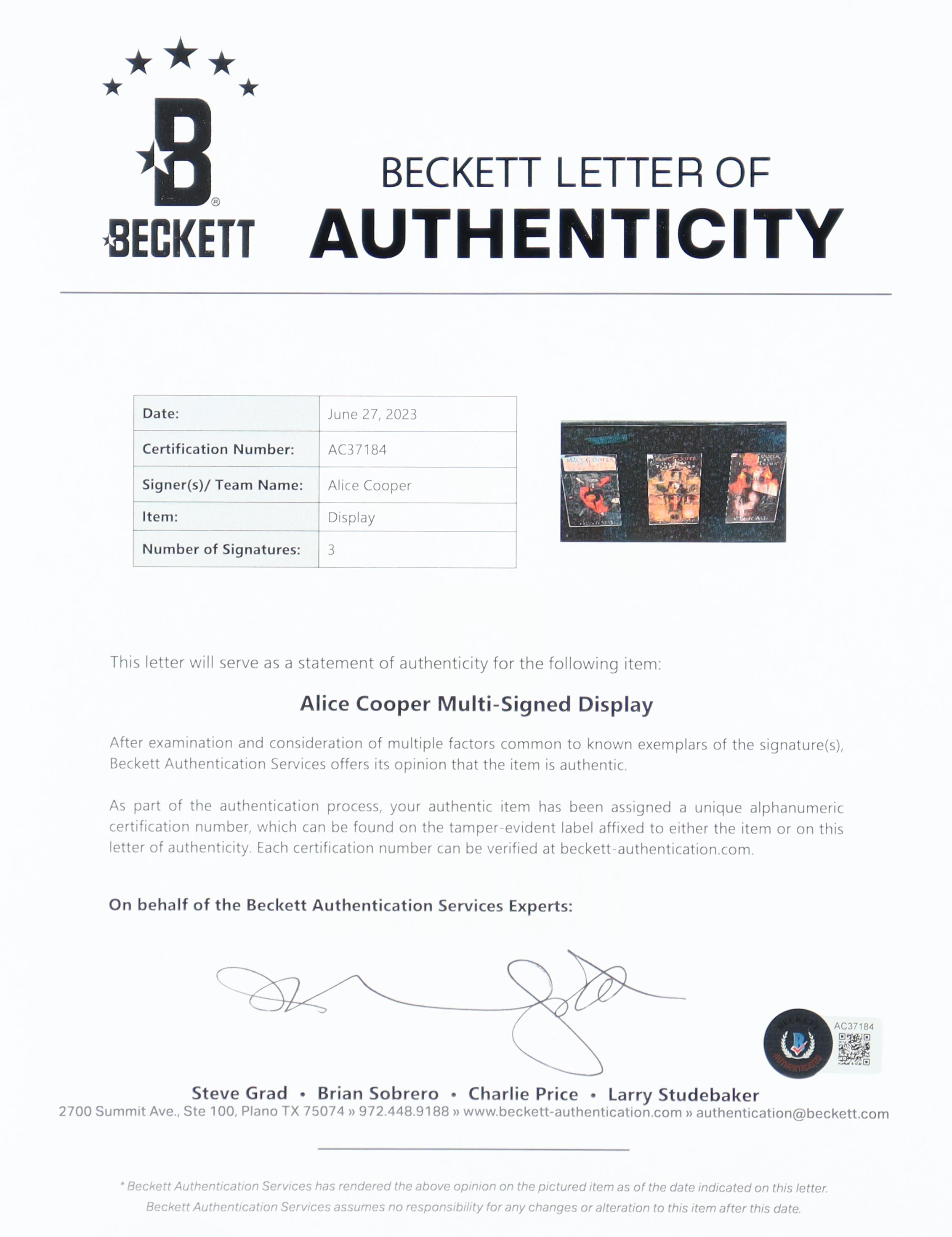 Custom frame measures 19" x 35" in size. Includes complete set of (3) Marvel comics, each individually hand-signed by Alice Cooper.