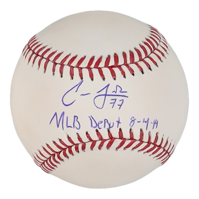 Carlos Frias Signed OML Baseball Inscribed "MLB Debut 8-4-14" (JSA)