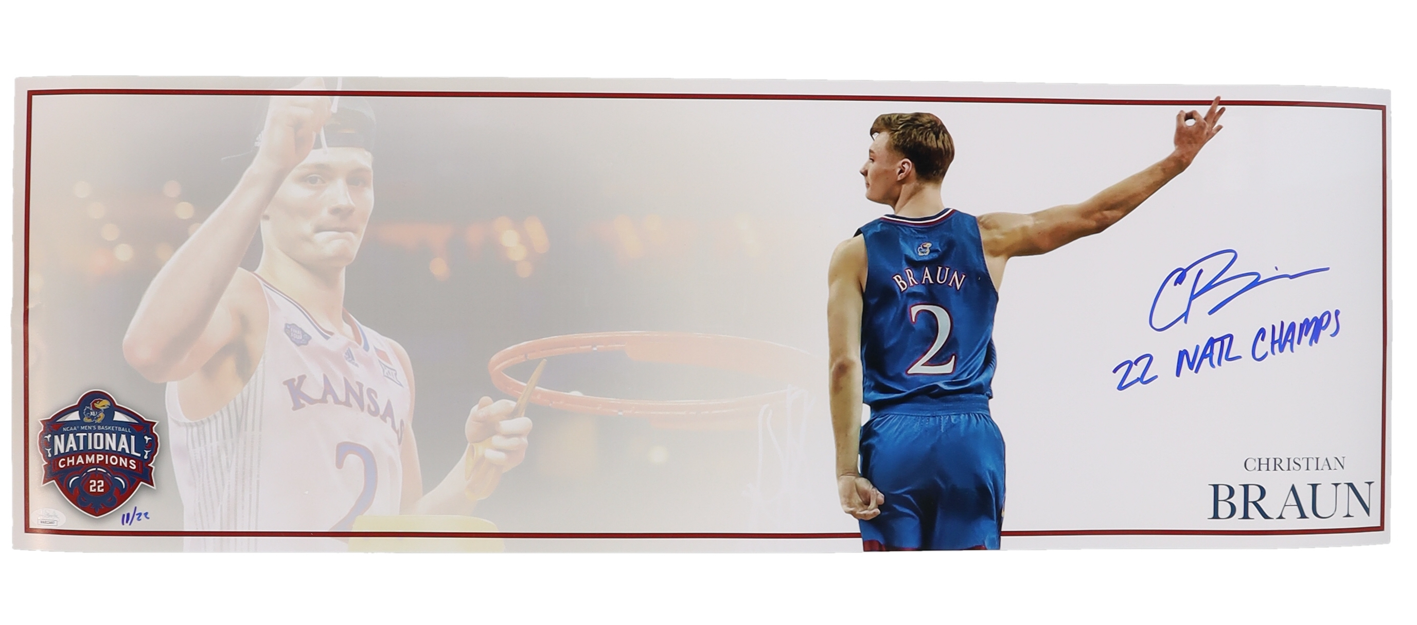 Christian Braun Signed Kansas Jayhawks 12x36 Poster Inscribed "22 NATL Champs!" (JSA)
