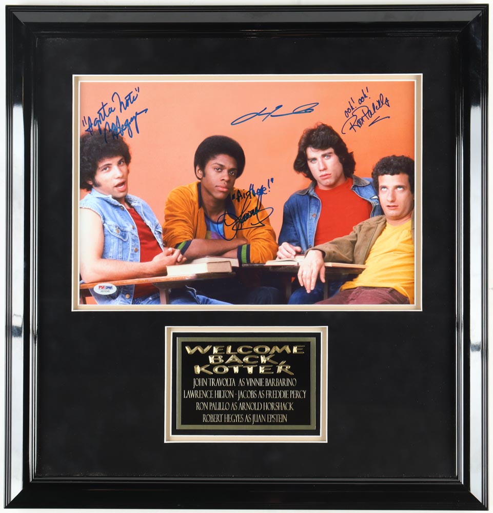 "Welcome Back, Kotter" Custom Framed Photo Signed by (4) with John Travolta, Lawrence Hilton, Ron Palillo & Robert Hegyes with (3) Catch Phrase Inscriptions (PSA)