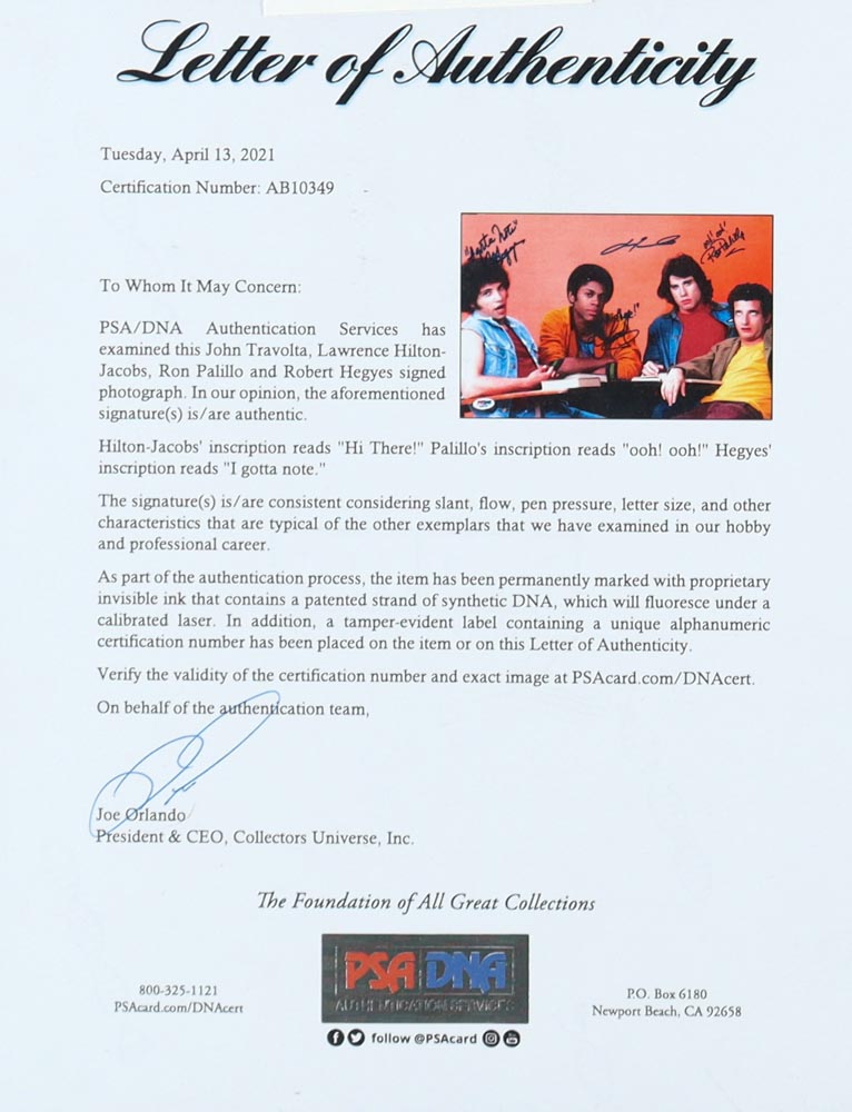 Custom frame measures 21" x 22" in size. Features a photo that has been hand-signed and inscribed by John Travolta, Lawrence Hilton, Ron Palillo and Robert Hegyes.