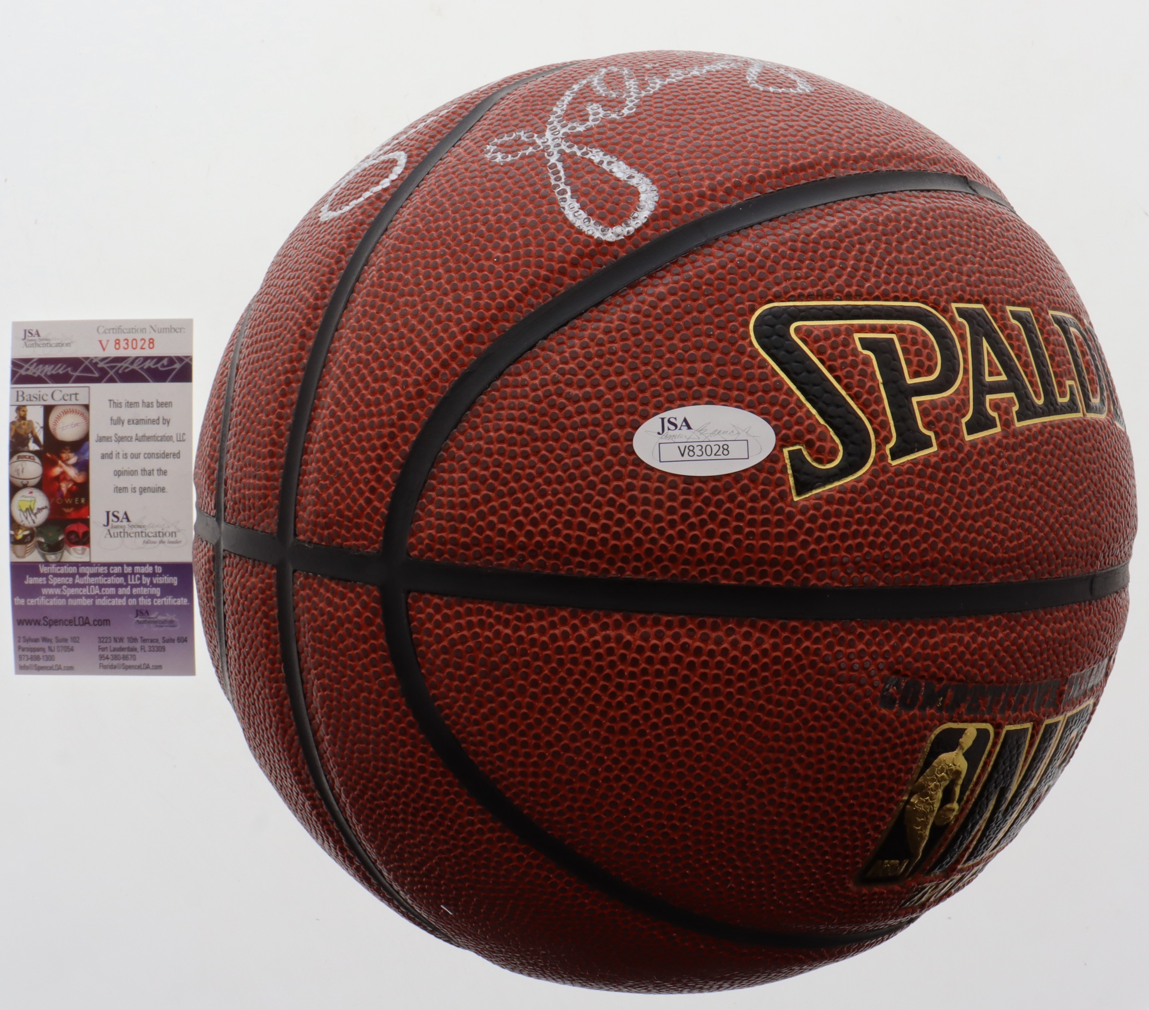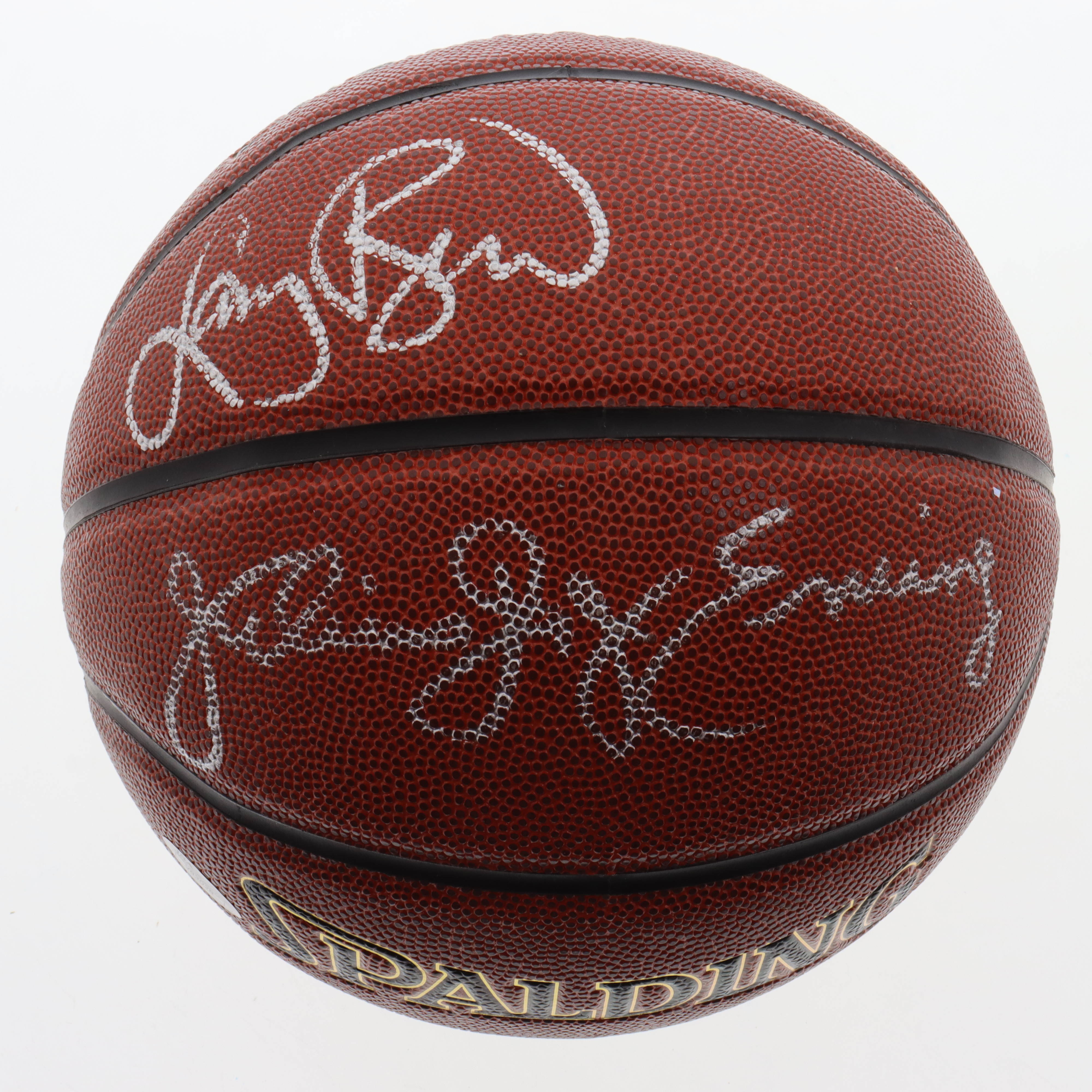Spalding NBA basketball. Hand-signed by Larry Bird (Boston Celtics, HOF) and Julius Erving (Philadelphia 76ers, HOF).