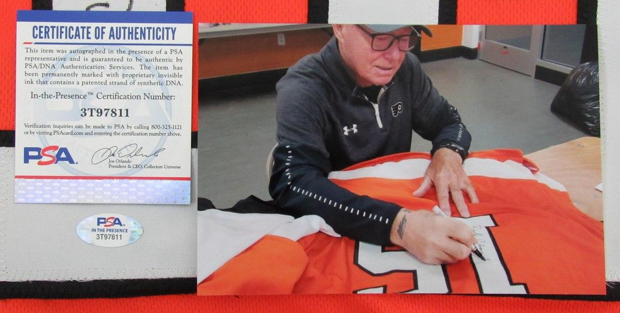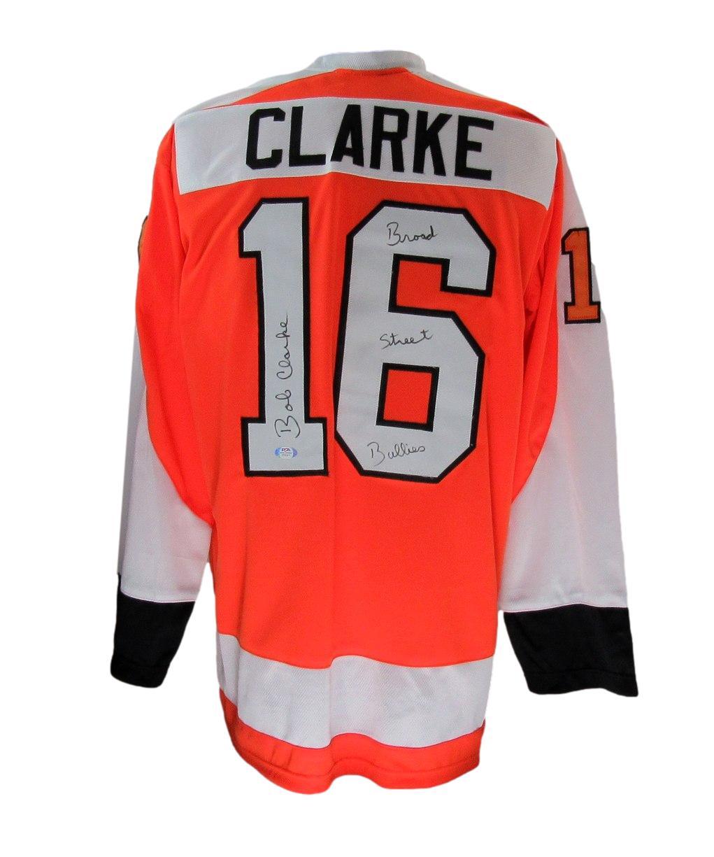 Custom jersey everything is sewn on, size XL. Hand-signed by Bobby Clarke (Philadelphia Flyers, HOF).
