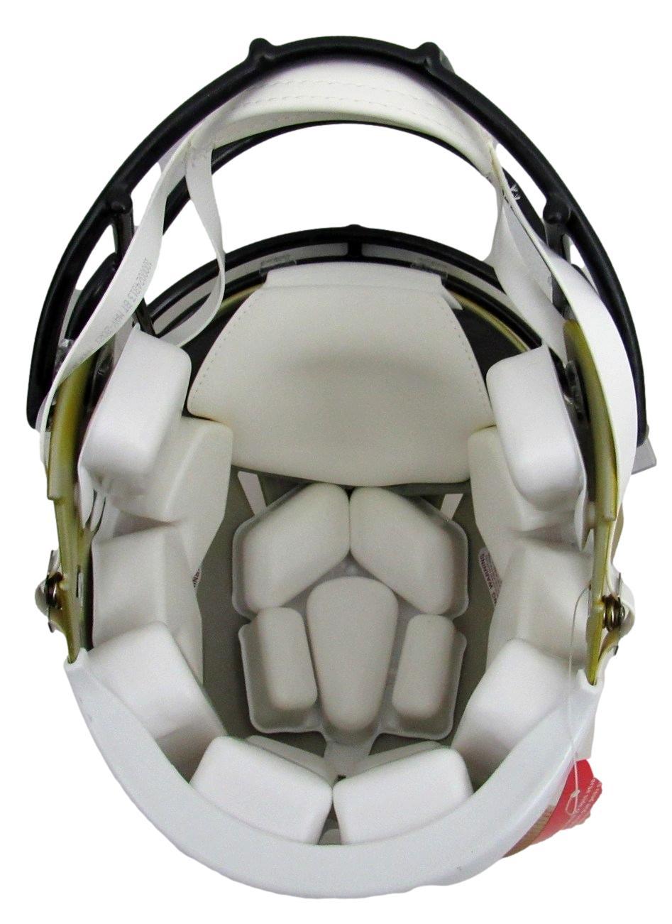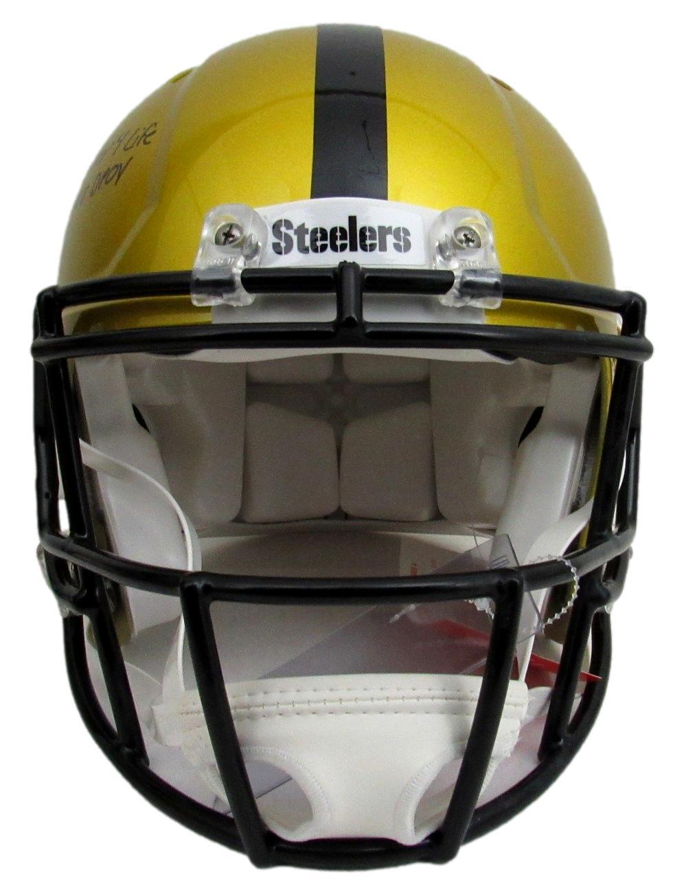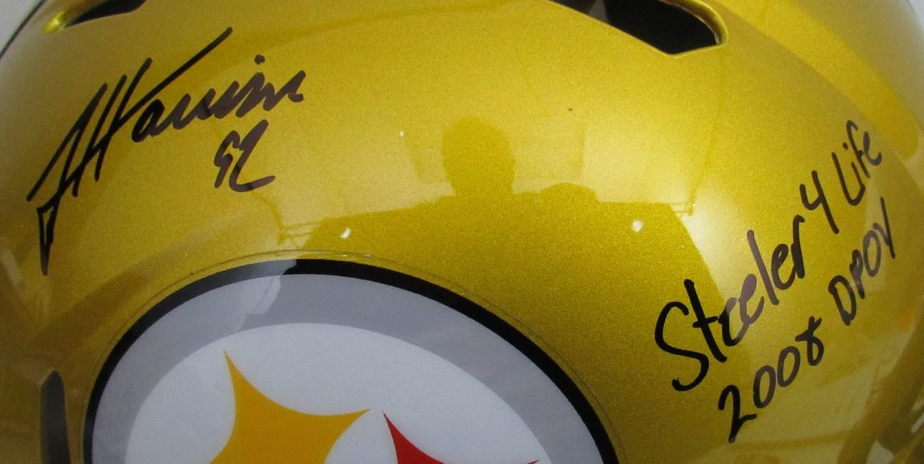 Riddell Pittsburgh Steelers full-size authentic, on-field Flash Alternate speed helmet. Hand-signed and inscribed by James Harrison.