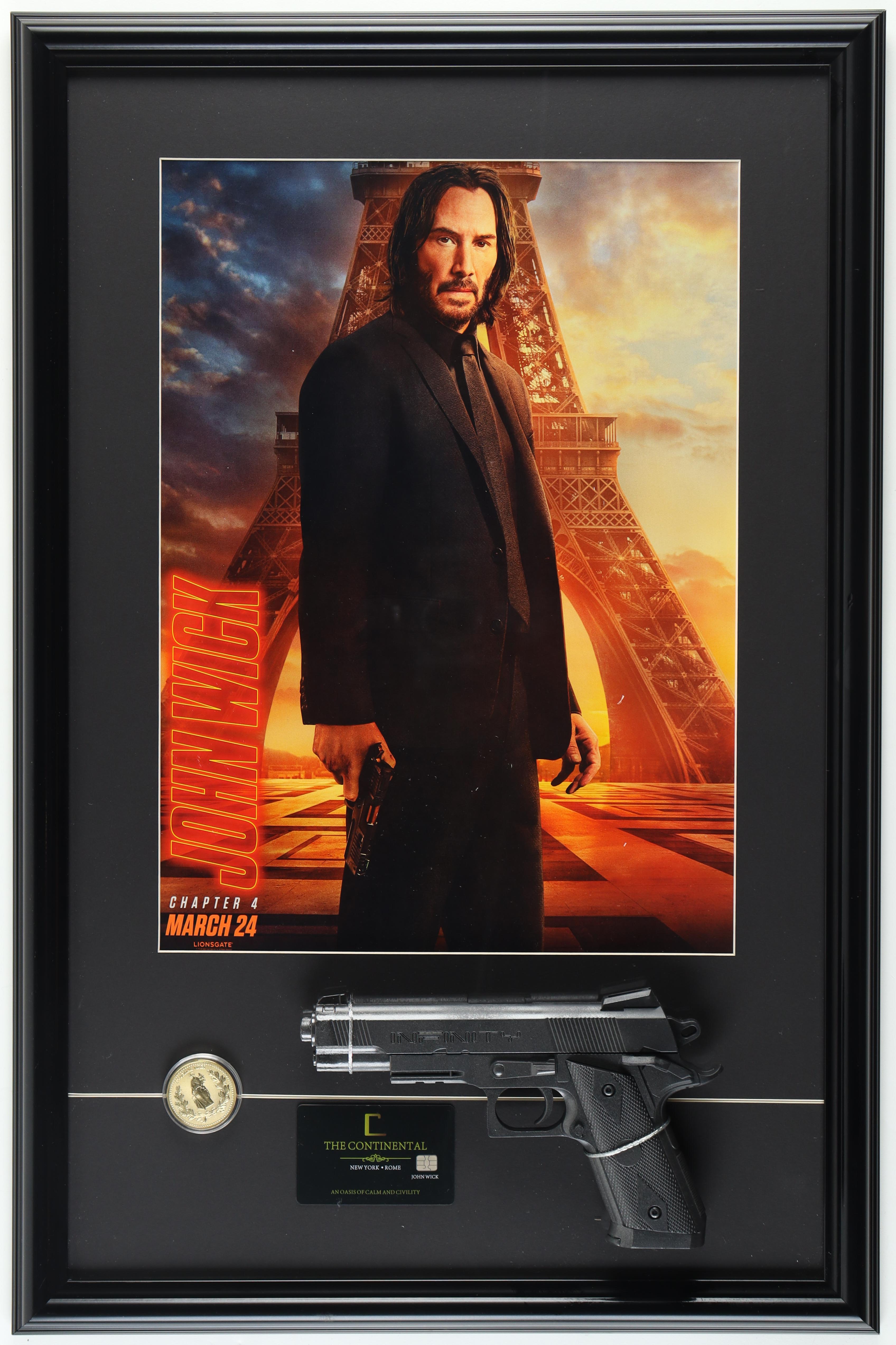 "John Wick: Chapter Four" Custom Framed Movie Poster Display with Prop Replica Pistol, Continental Key Card & Gold Coin