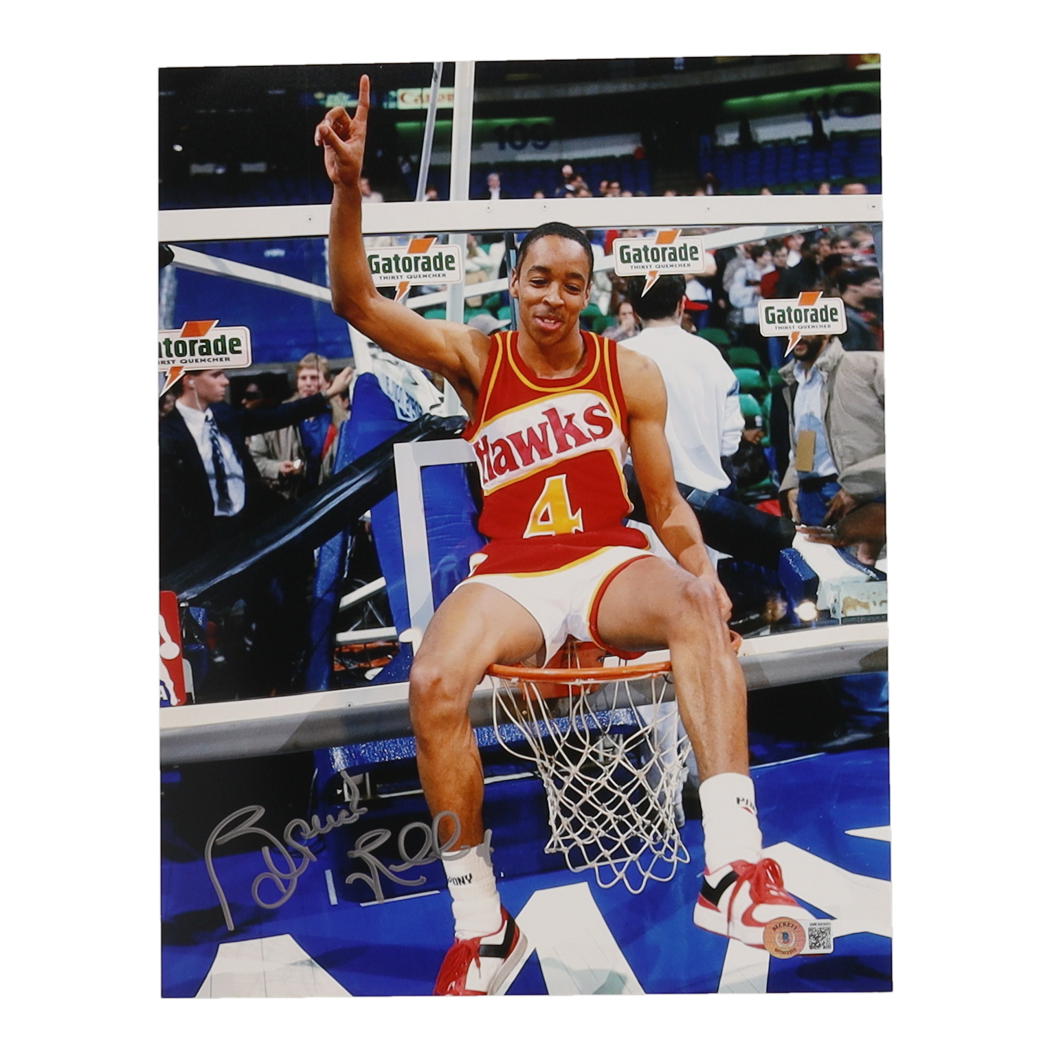 Photo measures 11" x 14" in size and has been hand-signed by Spud Webb (Atlanta Hawks).
