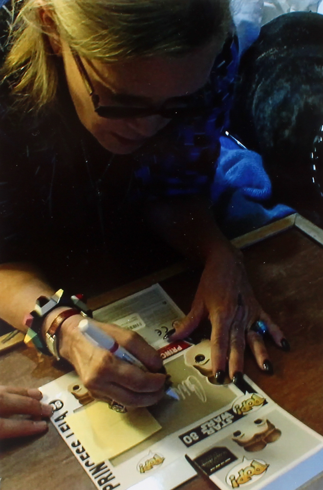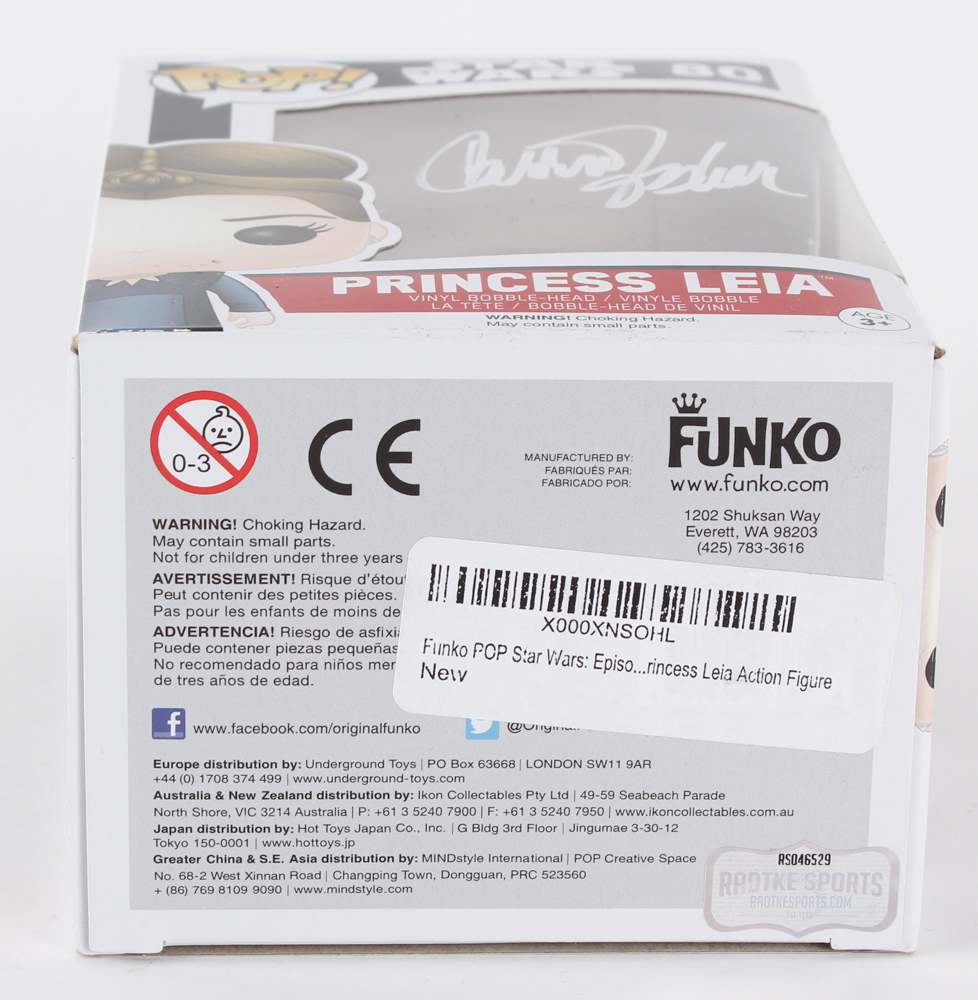 Funko Pop vinyl bobble head measures approximately 4" in height. Packaging has been hand-signed in white paint pen by Carrie Fisher.