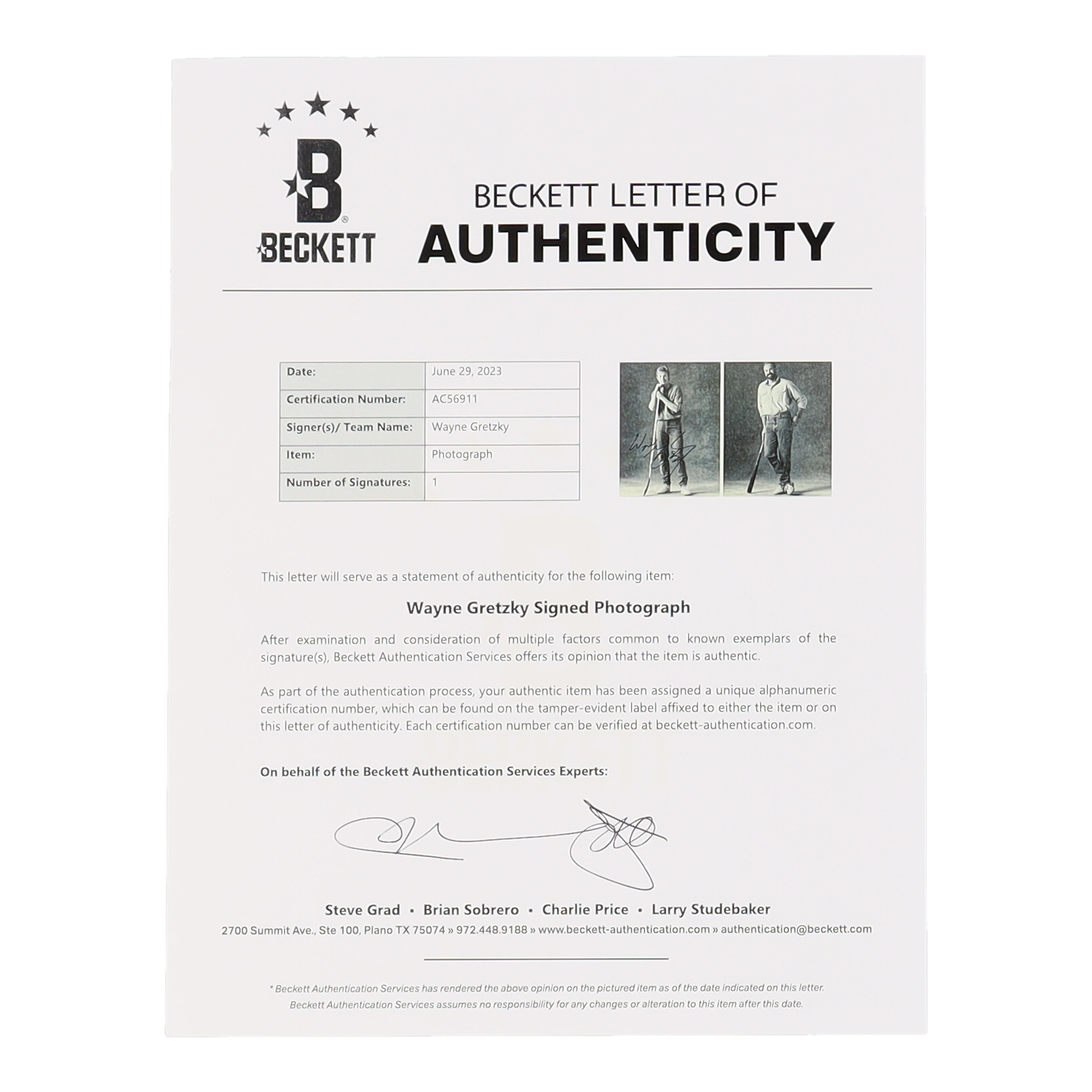 Photo measures 8" x 10" in size and has been hand-signed by Wayne Gretzky (Edmonton Oilers, HOF).