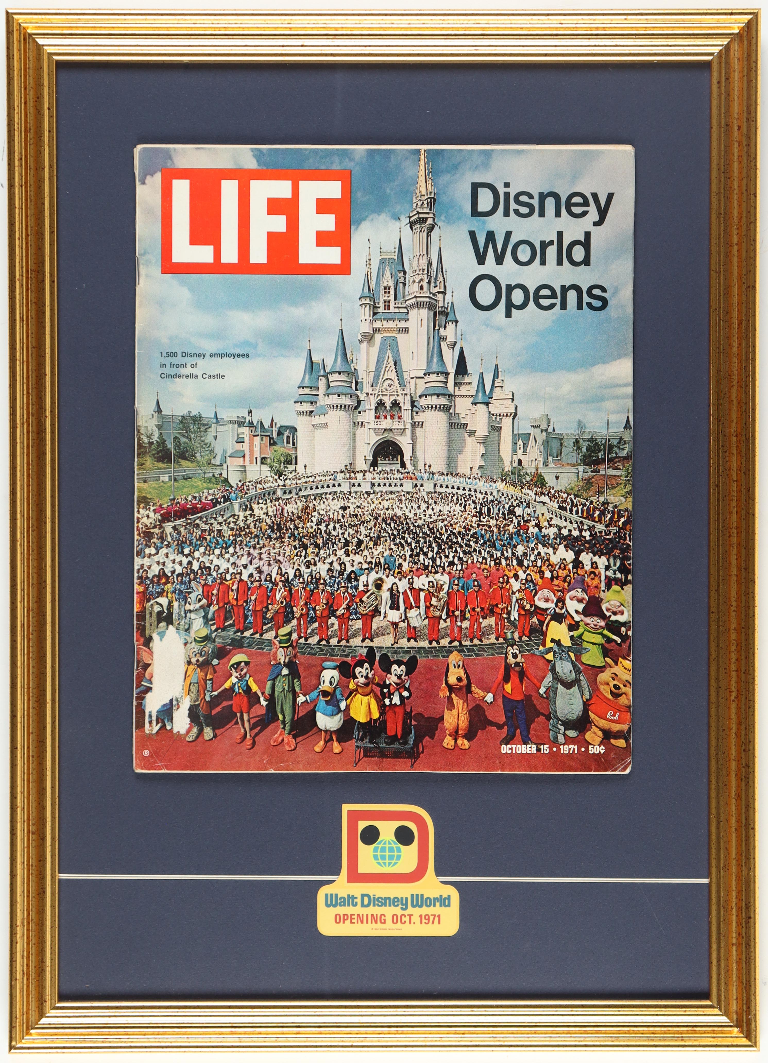 Custom frame measures 16" x 22" in size. Features a "Time" magazine dated October 15th, 1971 as well as a Disney World decal.