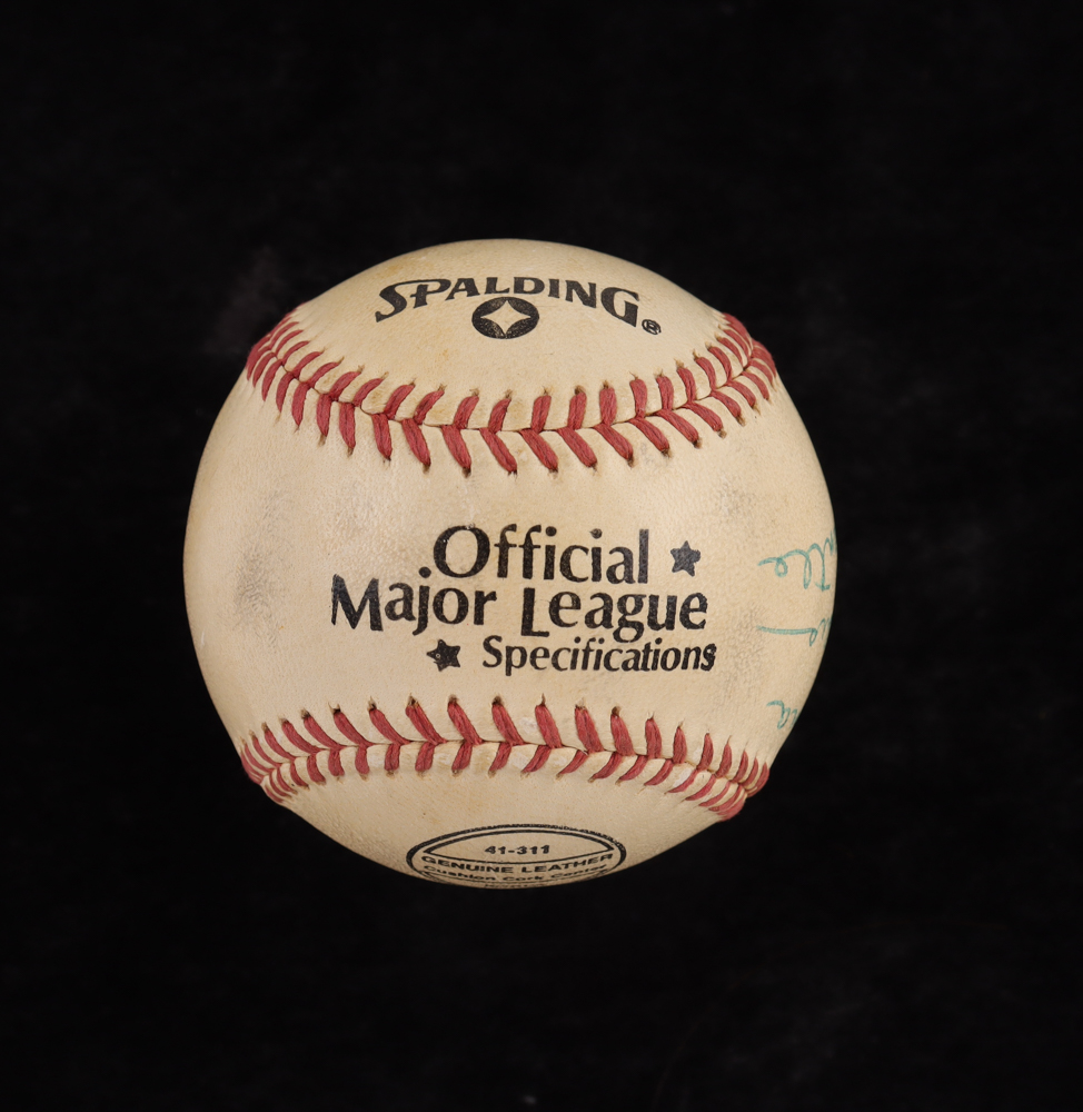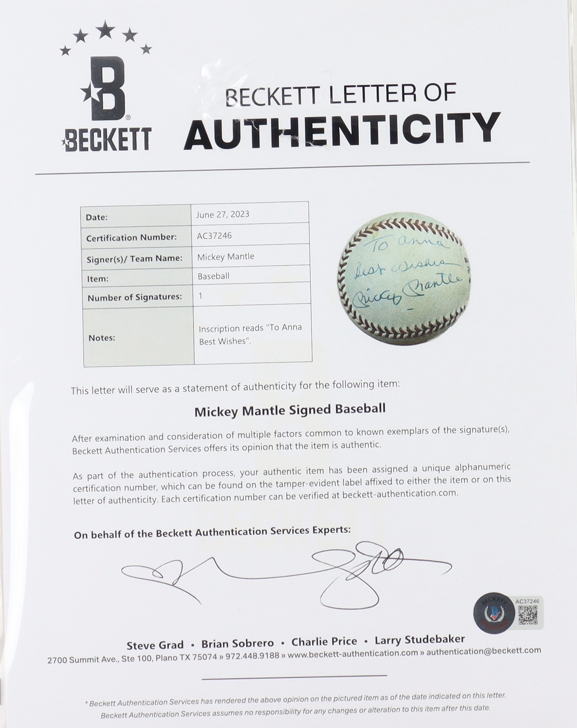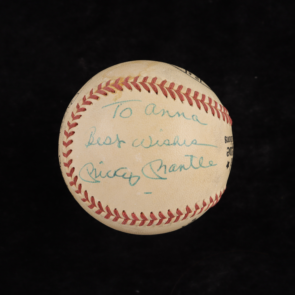 Rawlings Official Major League baseball. Hand-signed and inscribed by Mickey Mantle (D. 1995, New York Yankees, HOF). Please note, the baseball has been personalized "To Anna".