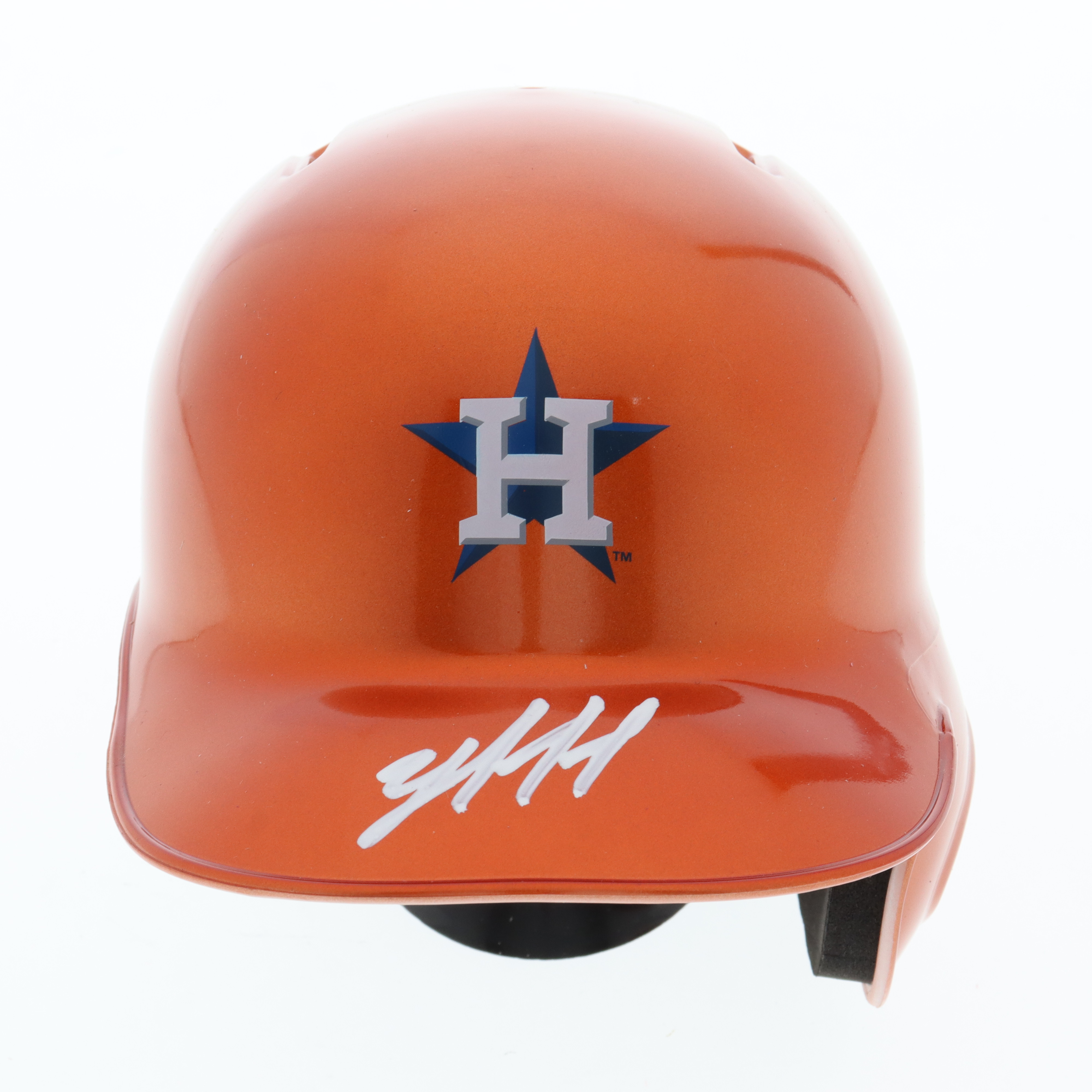 Riddell Houston Astros baseball mini helmet. Hand-signed by Yordan Alvarez.