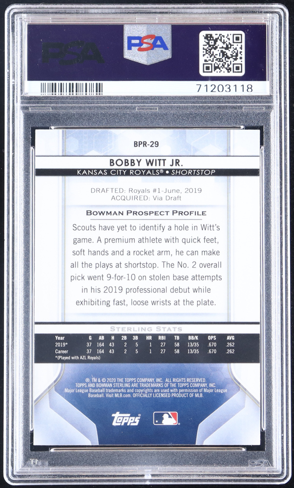 Bobby Witt Jr. 2020 Bowman Sterling Prospects #BPR29 (PSA 10)