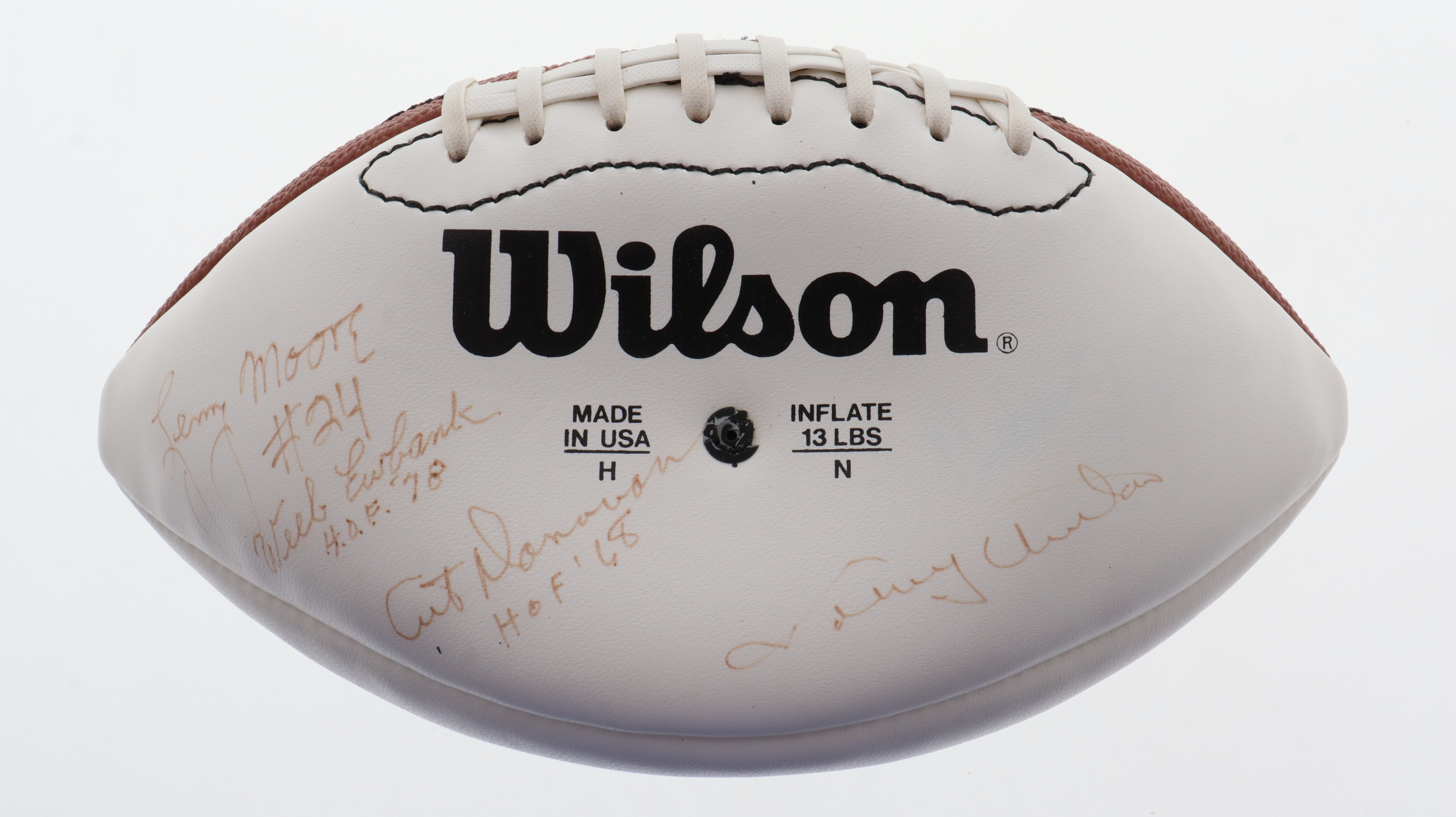 Wilson NFL football has been hand-signed and inscribed by Lenny Moore, Weeb Ewbank, Art Donovan and Johnny Unitas.