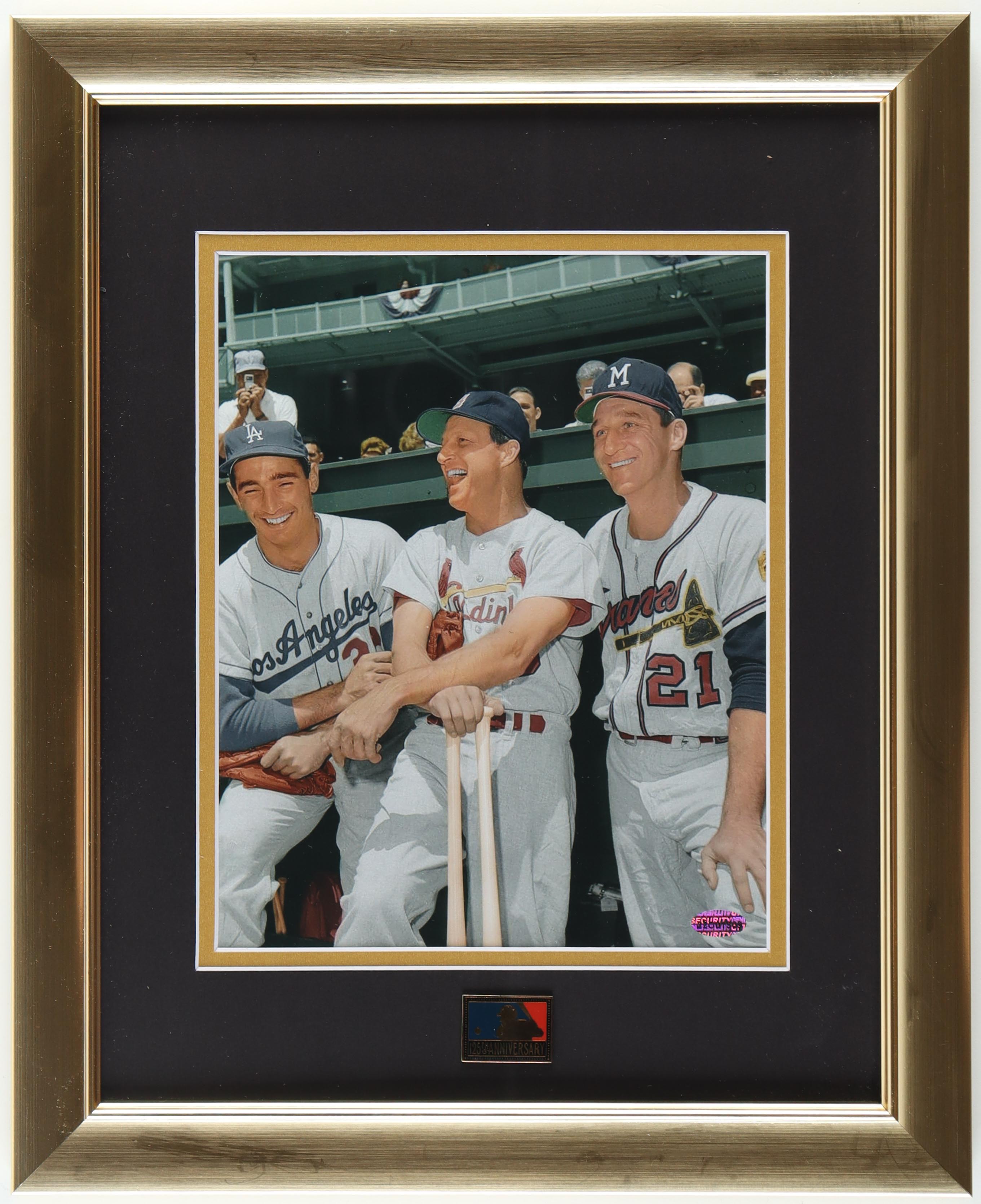 Custom frame measures 13" x 16" in size and features a photo of Sandy Koufax (Los Angeles Dodgers, HOF), Stan Musial (D. 2013, St. Louis Cardinals, HOF) and Warren Spahn (D. 2003, Milwaukee Braves, HOF).