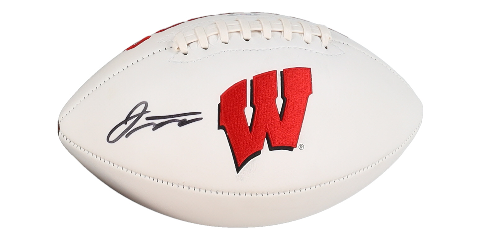 Wisconsin Badgers logo football. Hand-signed by Jonathan Taylor. Please note, the ball is slightly stained on the reverse side.