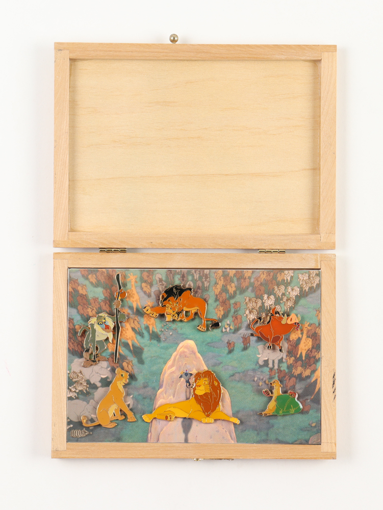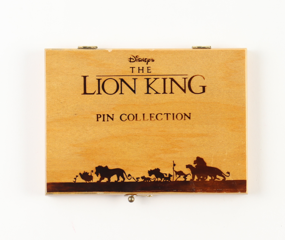 Disney's "The Lion King" vintage movie pin collection with original wooden box display. Please see photos for details regarding the condition of the set.