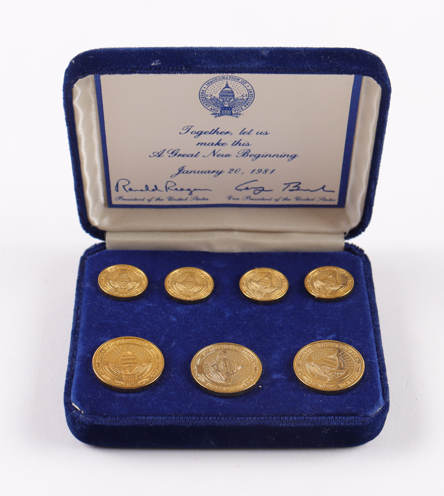 Set includes (7) original cuff links commemorating the January 20, 1981 inauguration of President Ronald Reagan and Vice President George H. W. Bush.