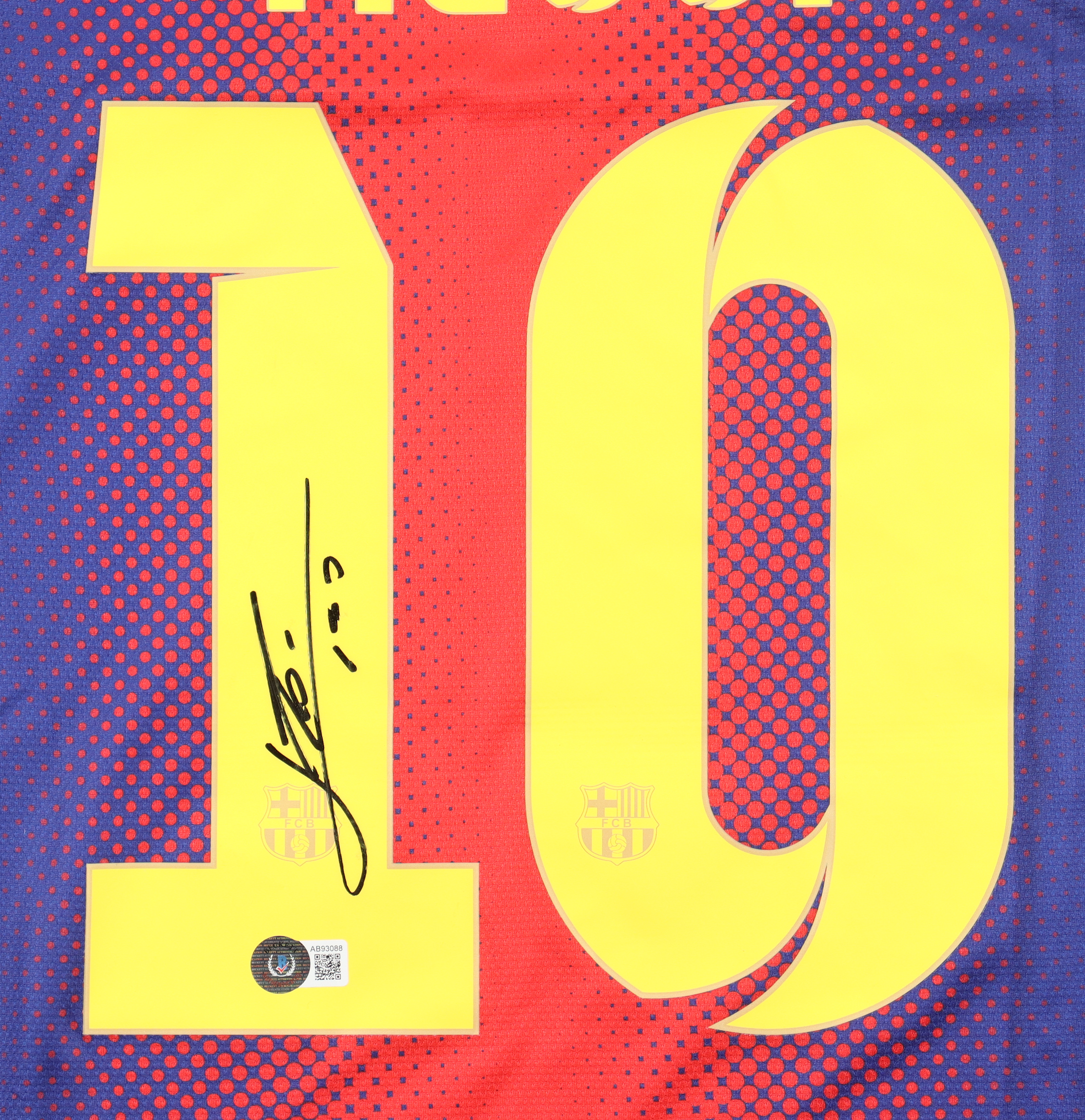 Nike jersey with everything printed on, size M. Hand-signed by Lionel Messi (Barcelona FC).