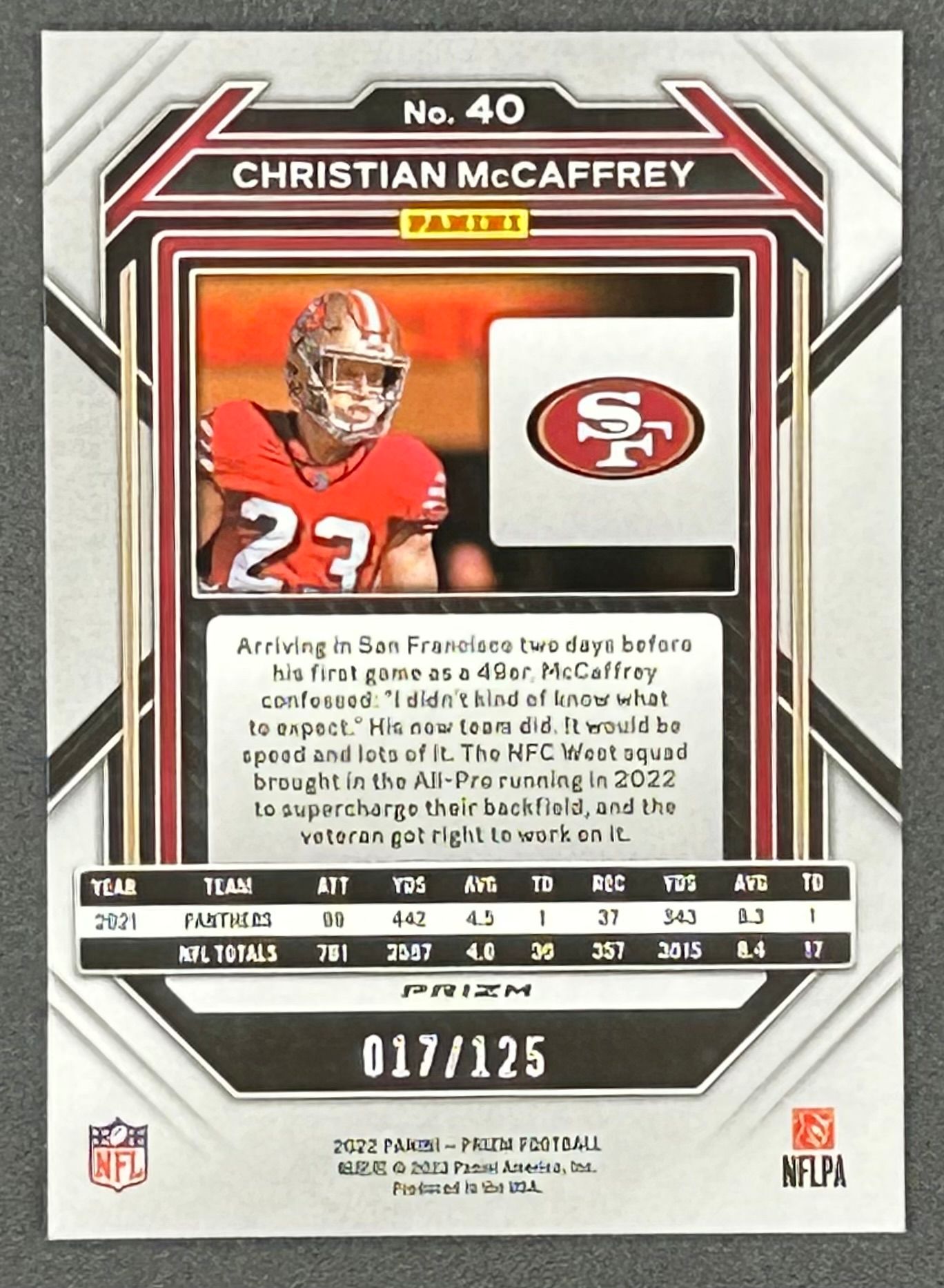 Christian McCaffrey 2022 Panini Prizm Prizms Purple #40 #17/125