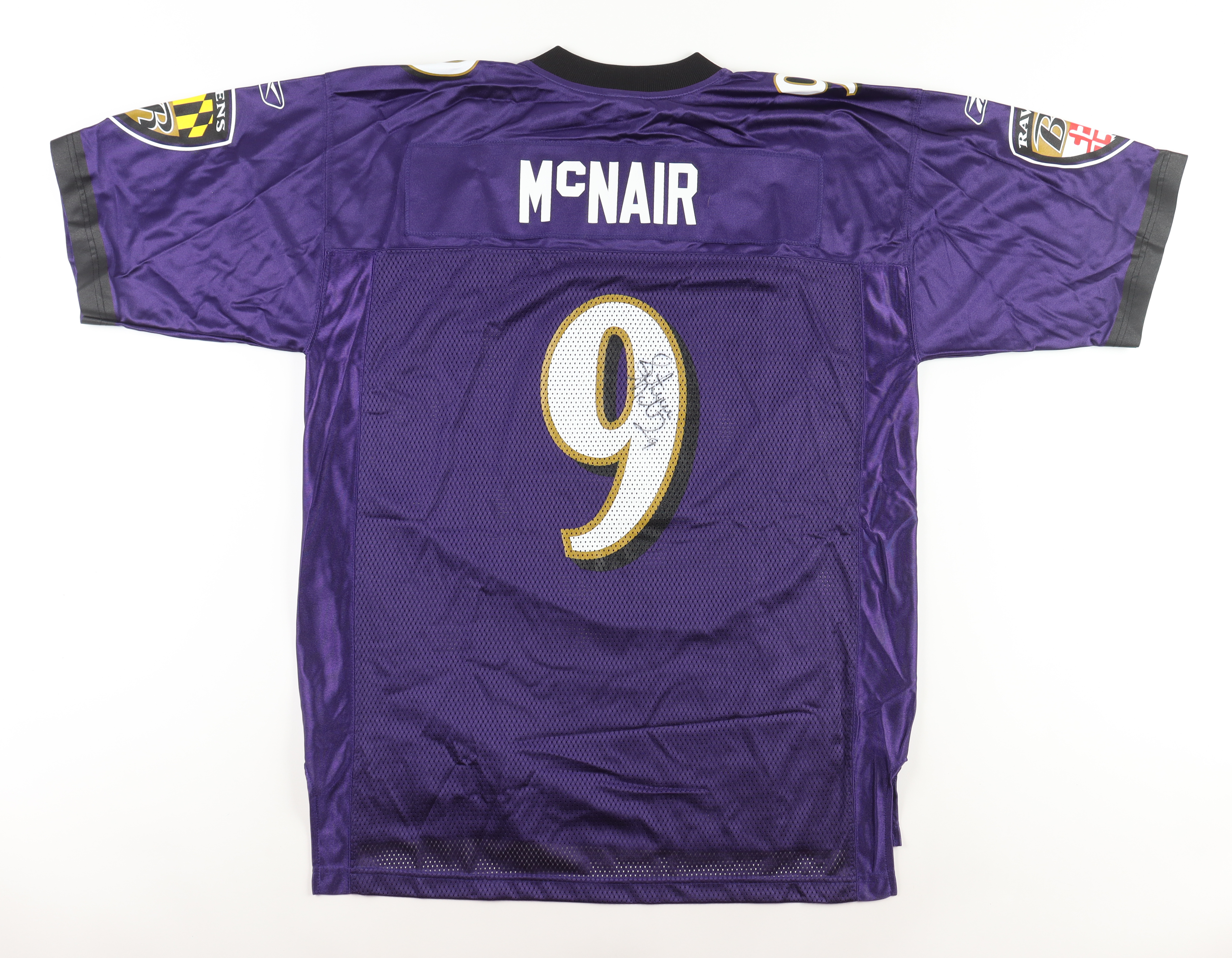 Reebok jersey with everything printed on, size L. Hand-signed by Steve McNair (D. 2009, Baltimore Ravens, HOF).