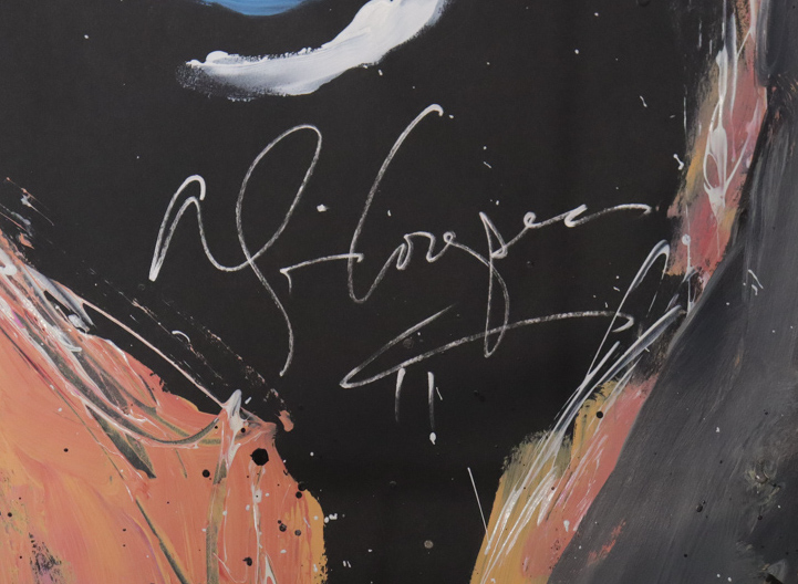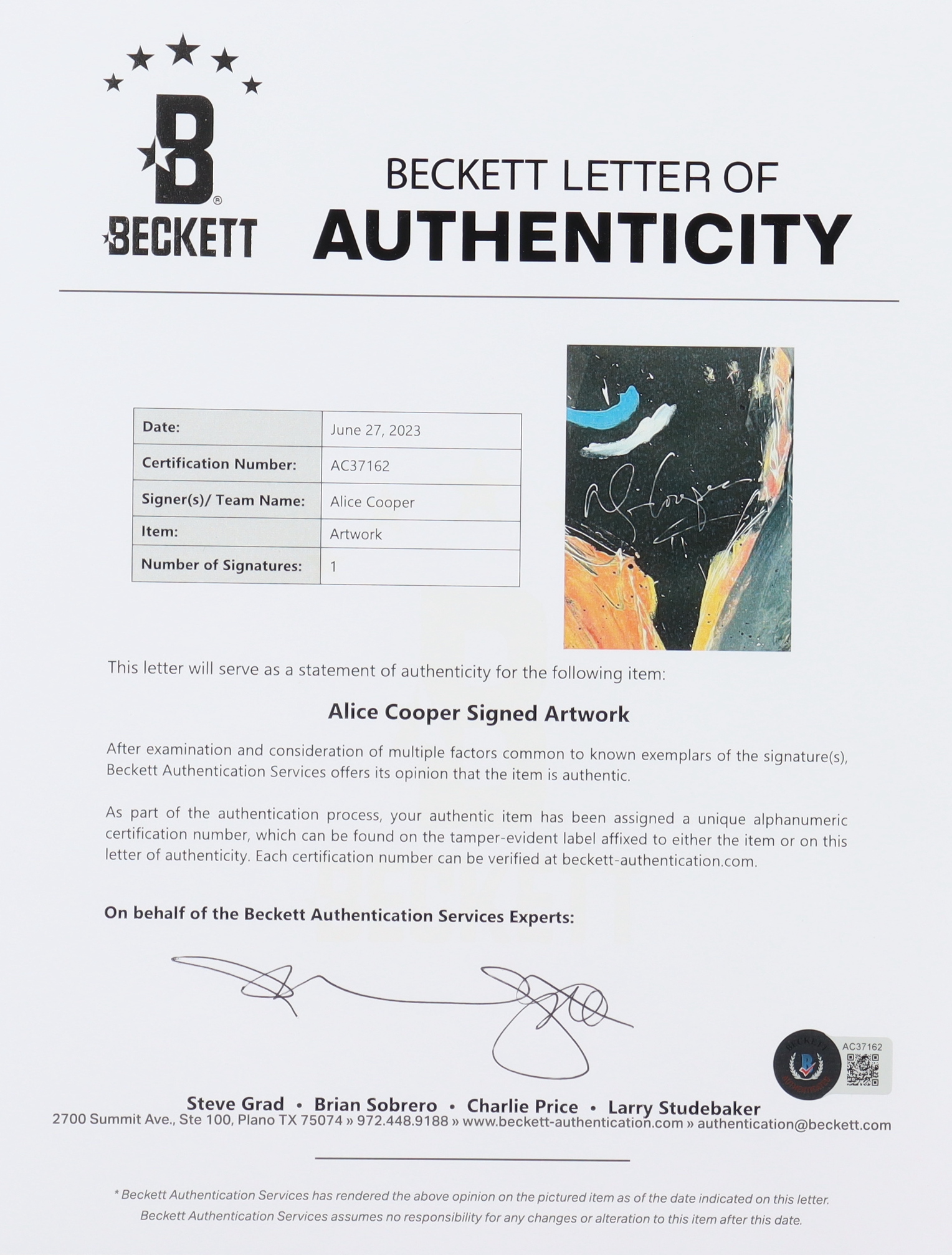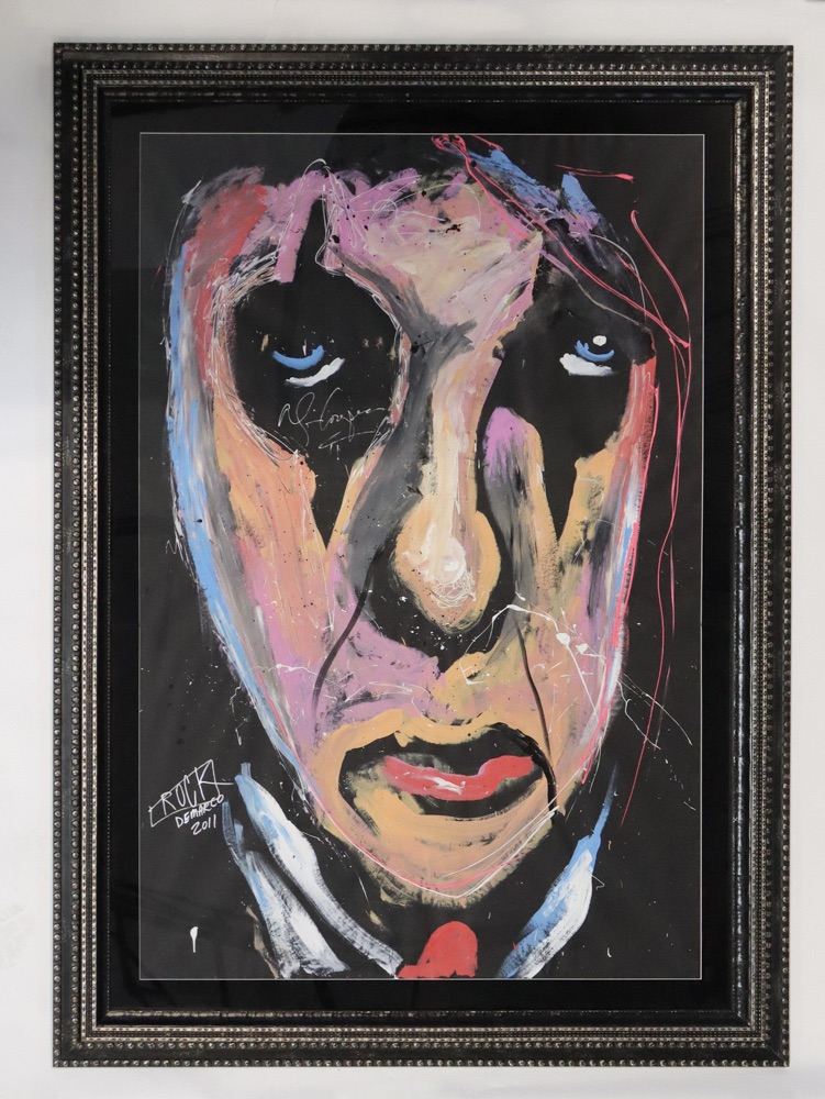 Oversized custom framed original artwork measures approximately 54" x 77" in size and features an abstract portrait of music legend, Alice Cooper. The painting has been hand-signed by Alice Cooper.
