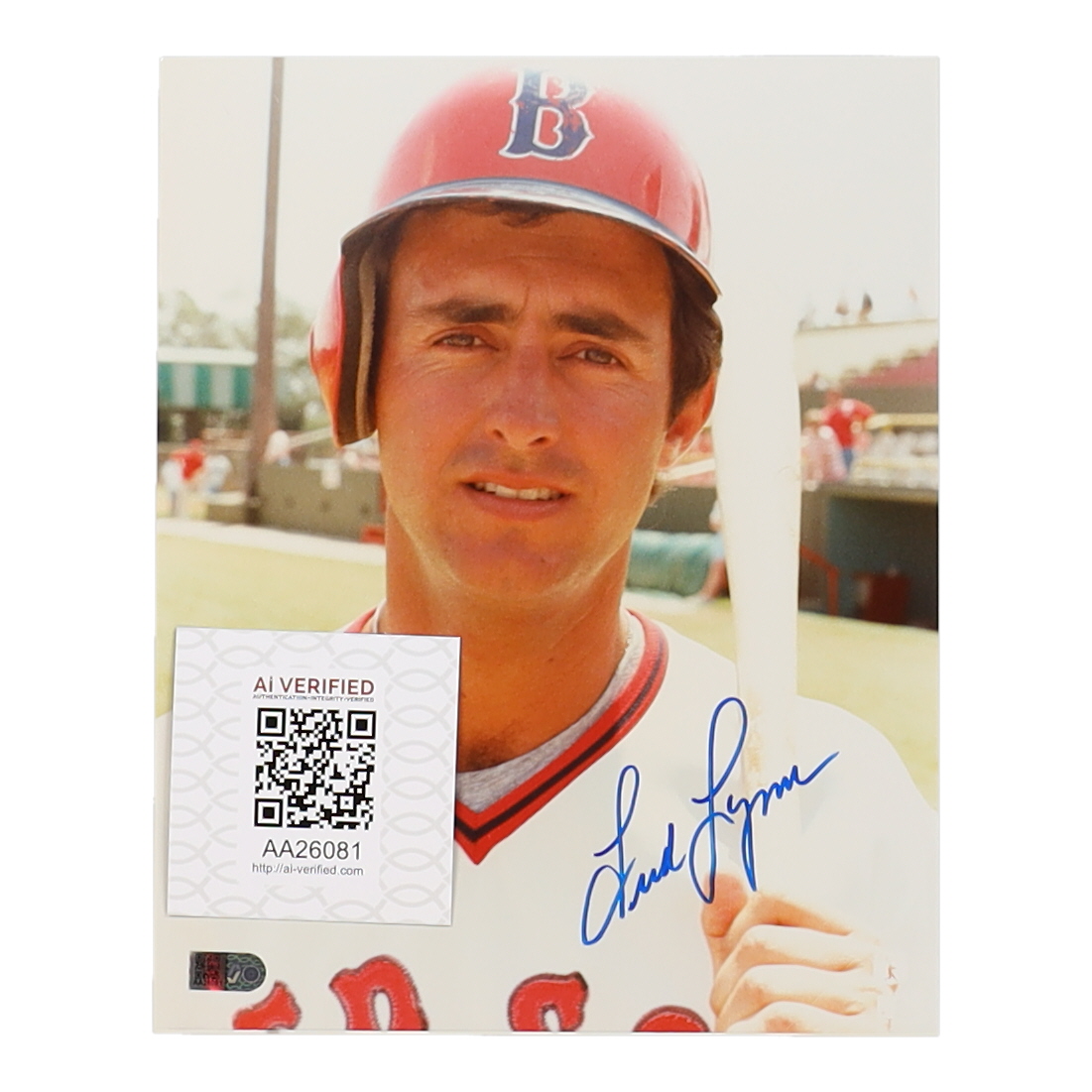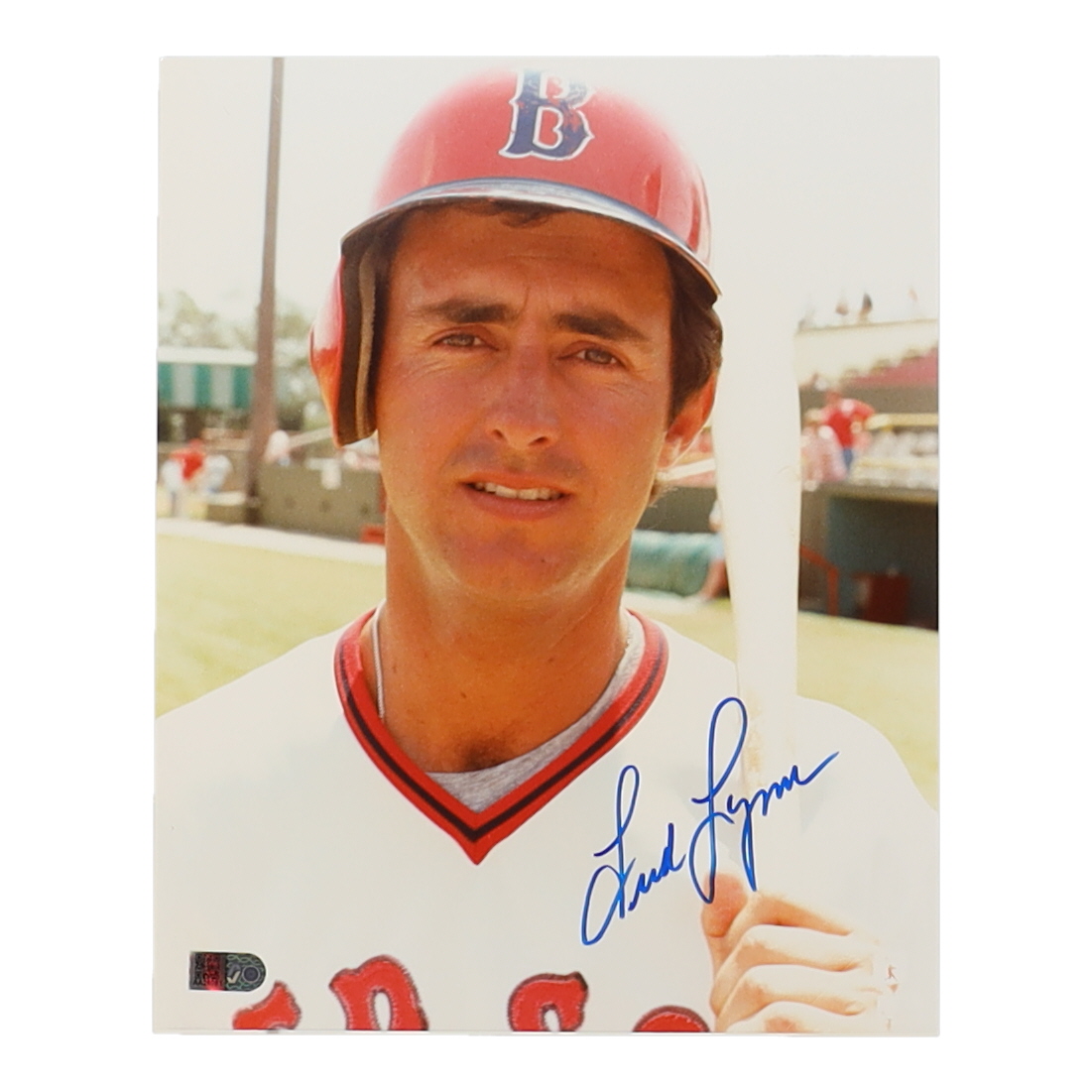 Photo measures 8" x 10" in size and has been hand-signed by Fred Lynn (Boston Red Sox).