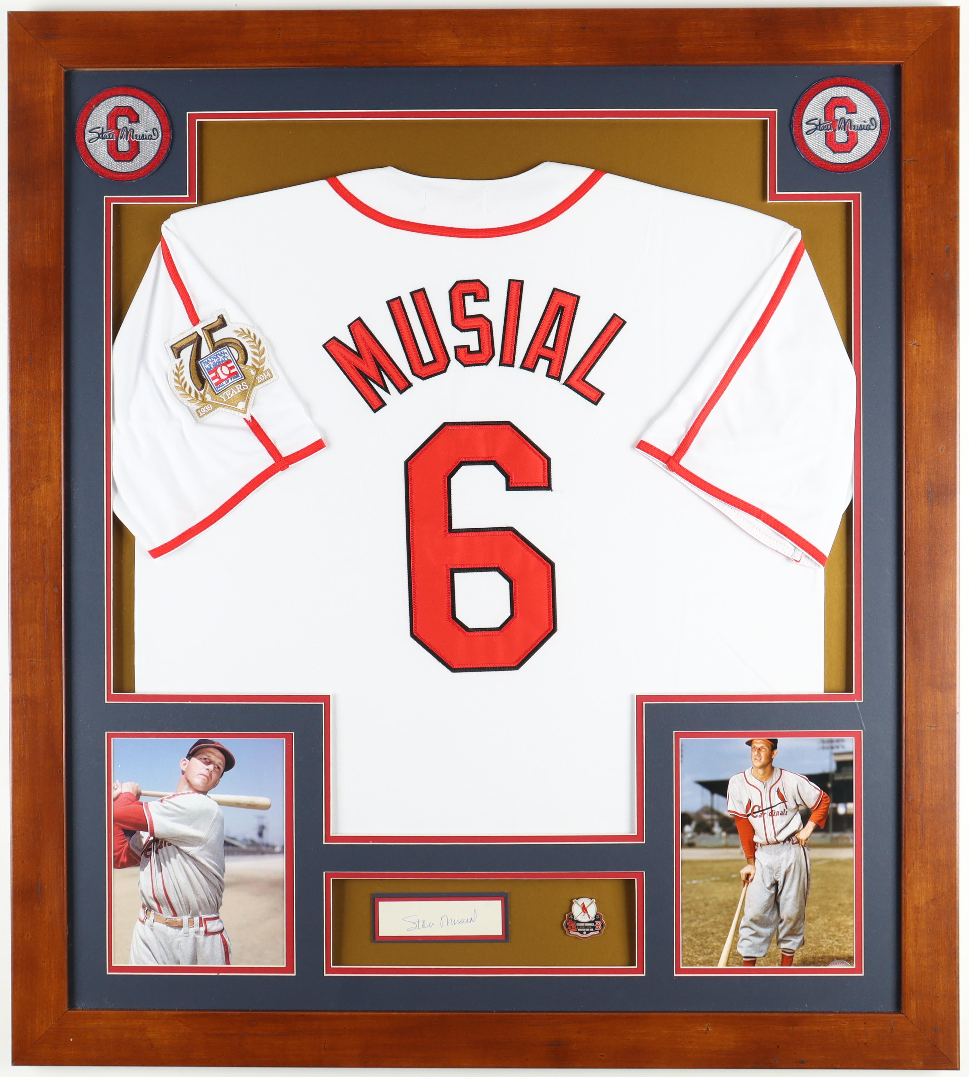 Custom frame measures approximately 33.5 x 38" in size and and features a cut that has been hand-signed by Stan Musial (D. 2013, St. Louis Cardinals, HOF). Includes jersey and pin.