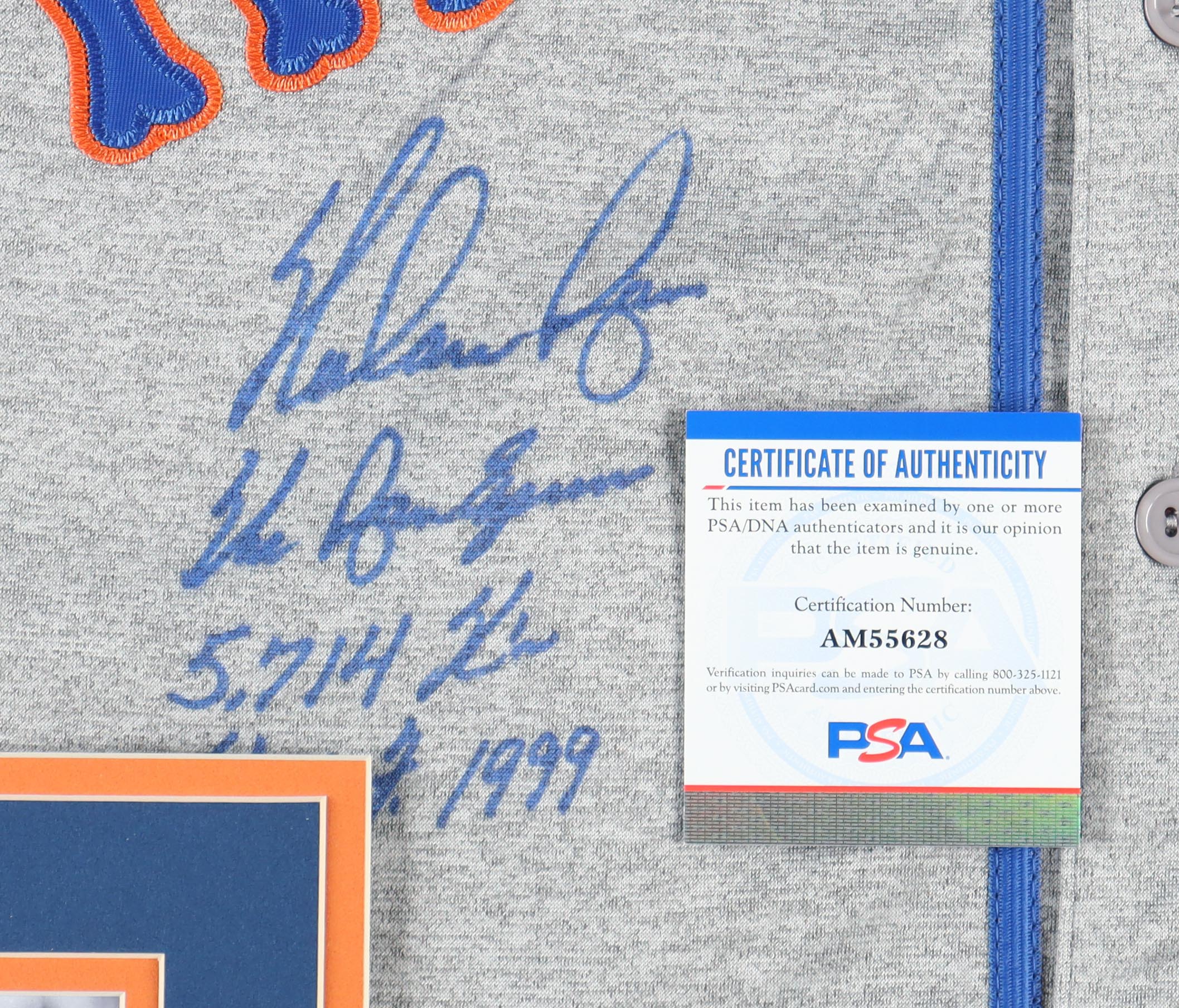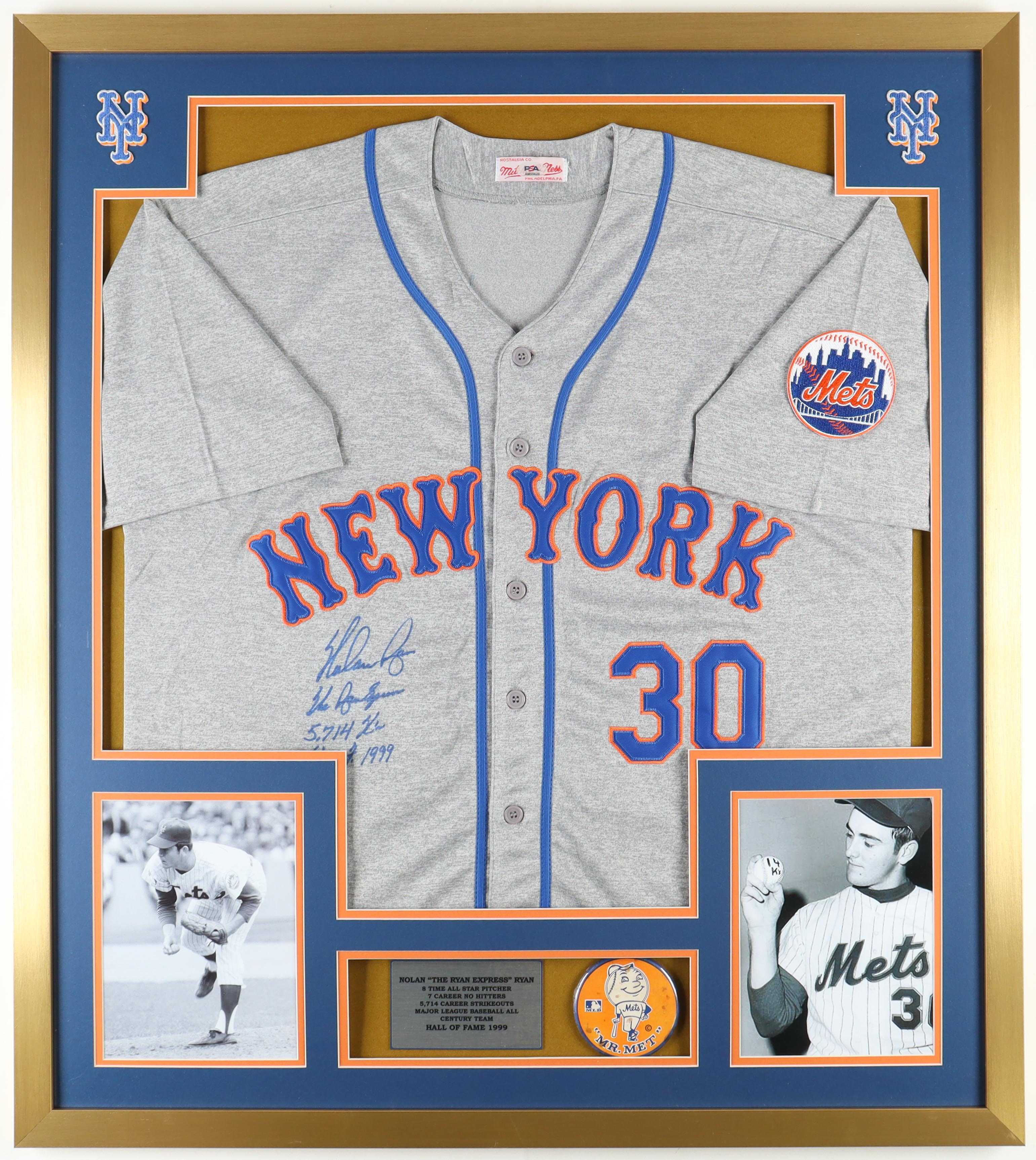 Nolan Ryan Signed Mets Custom Framed Mitchell & Ness Jersey Display with (3) Career Stat Inscriptions with Vintage 1969 Mets Lapel Pin (PSA)