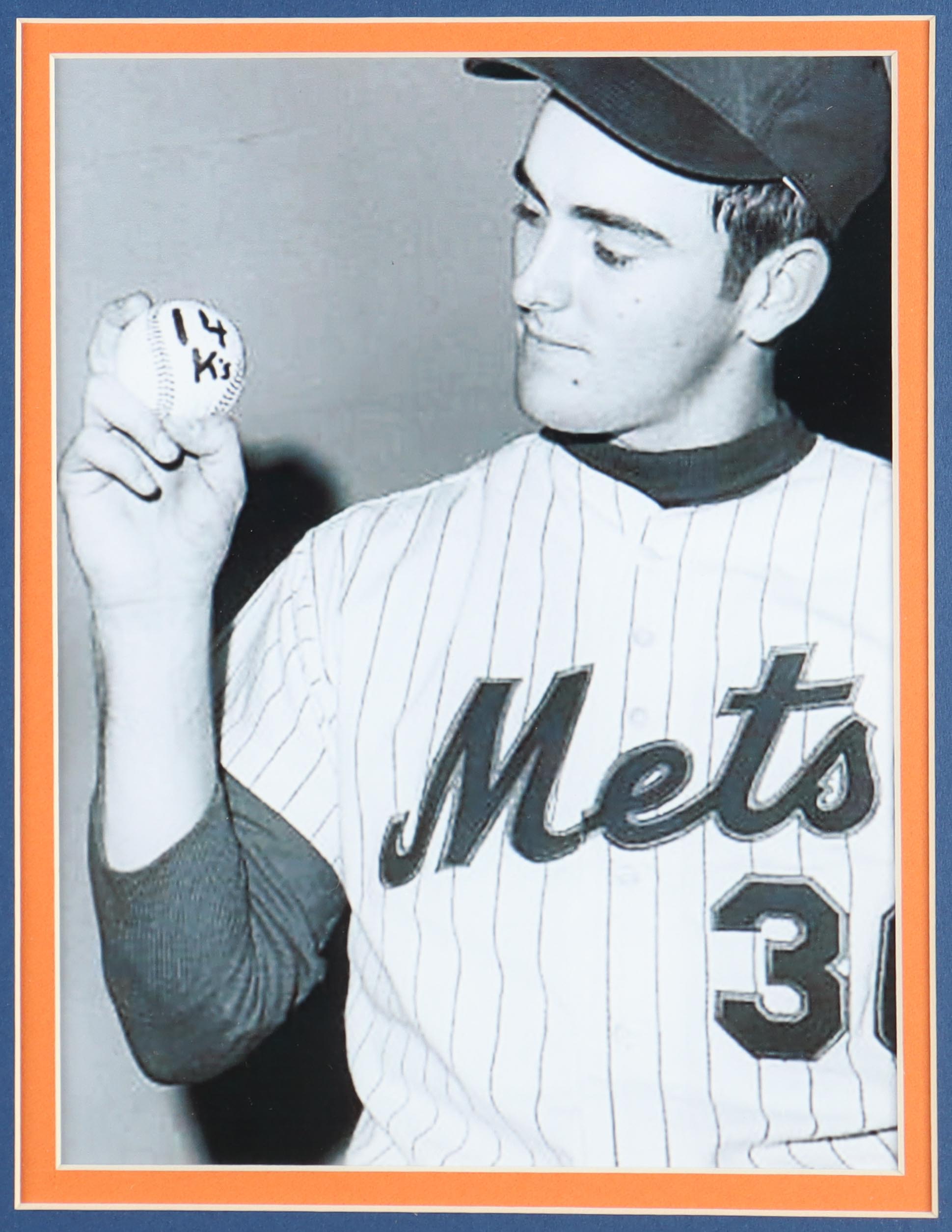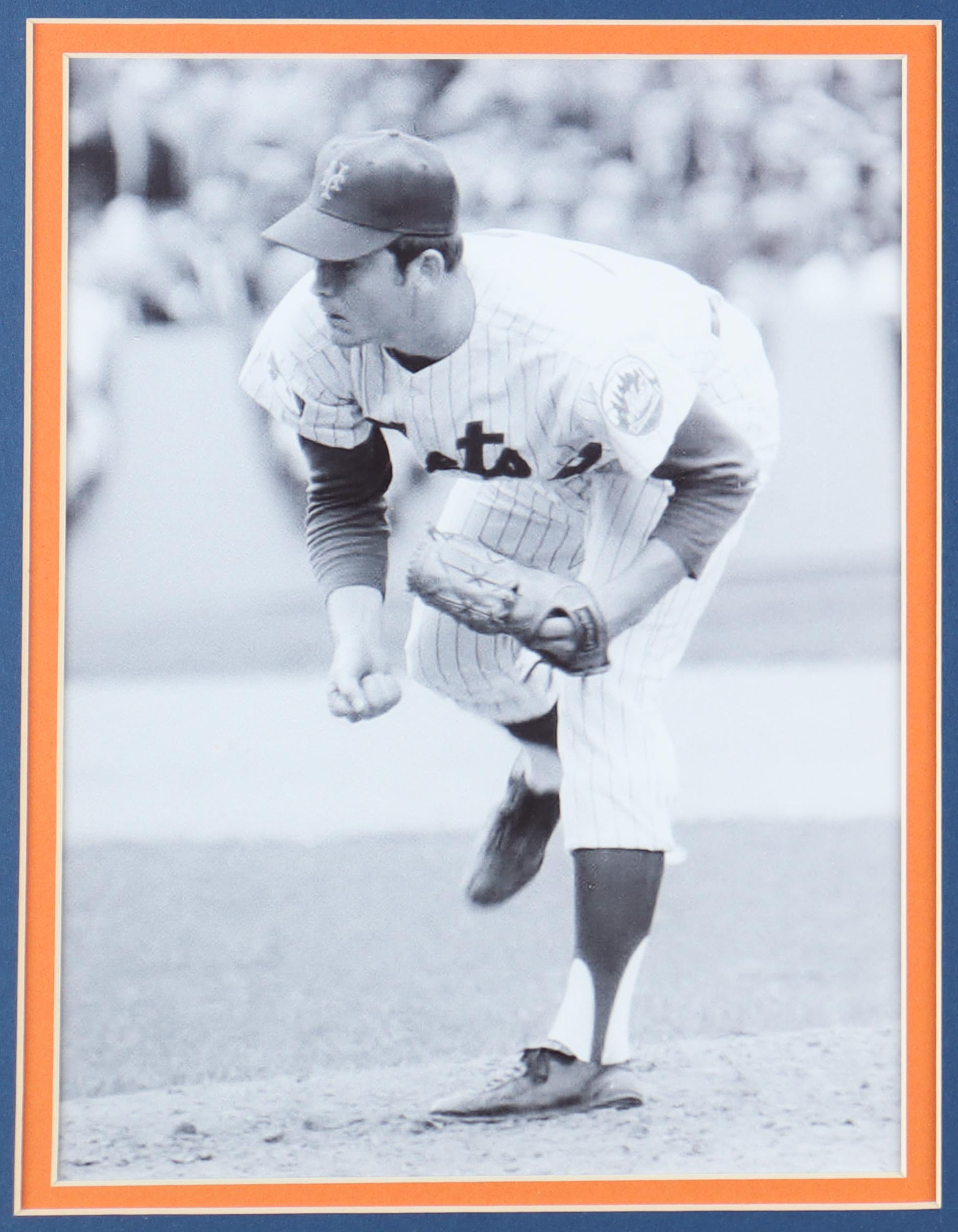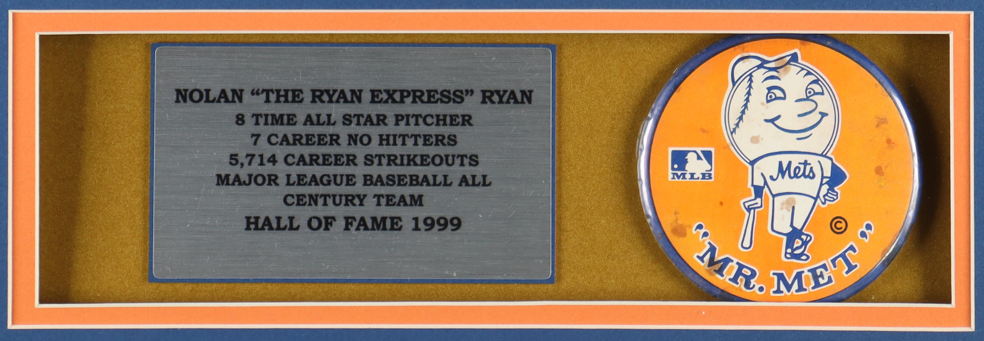 Custom frame measures 32" x 36" in size and features a Mitchell & Ness jersey that has been hand-signed and inscribed by Nolan Ryan (New York Mets, HOF). Includes pin. Please note, an inscription is obscured by the frame's matting.