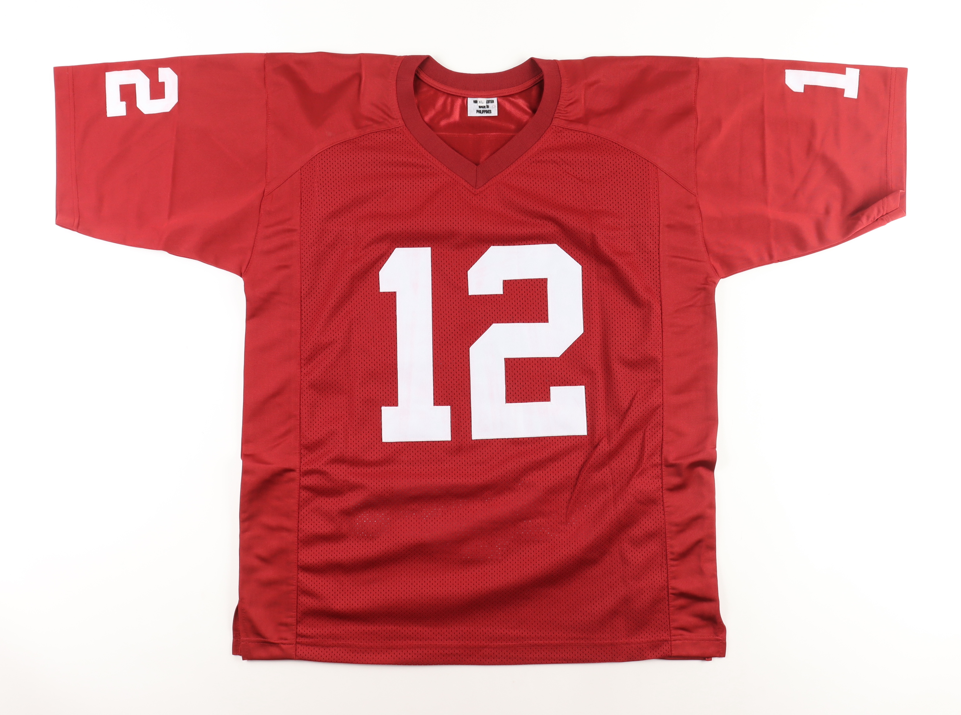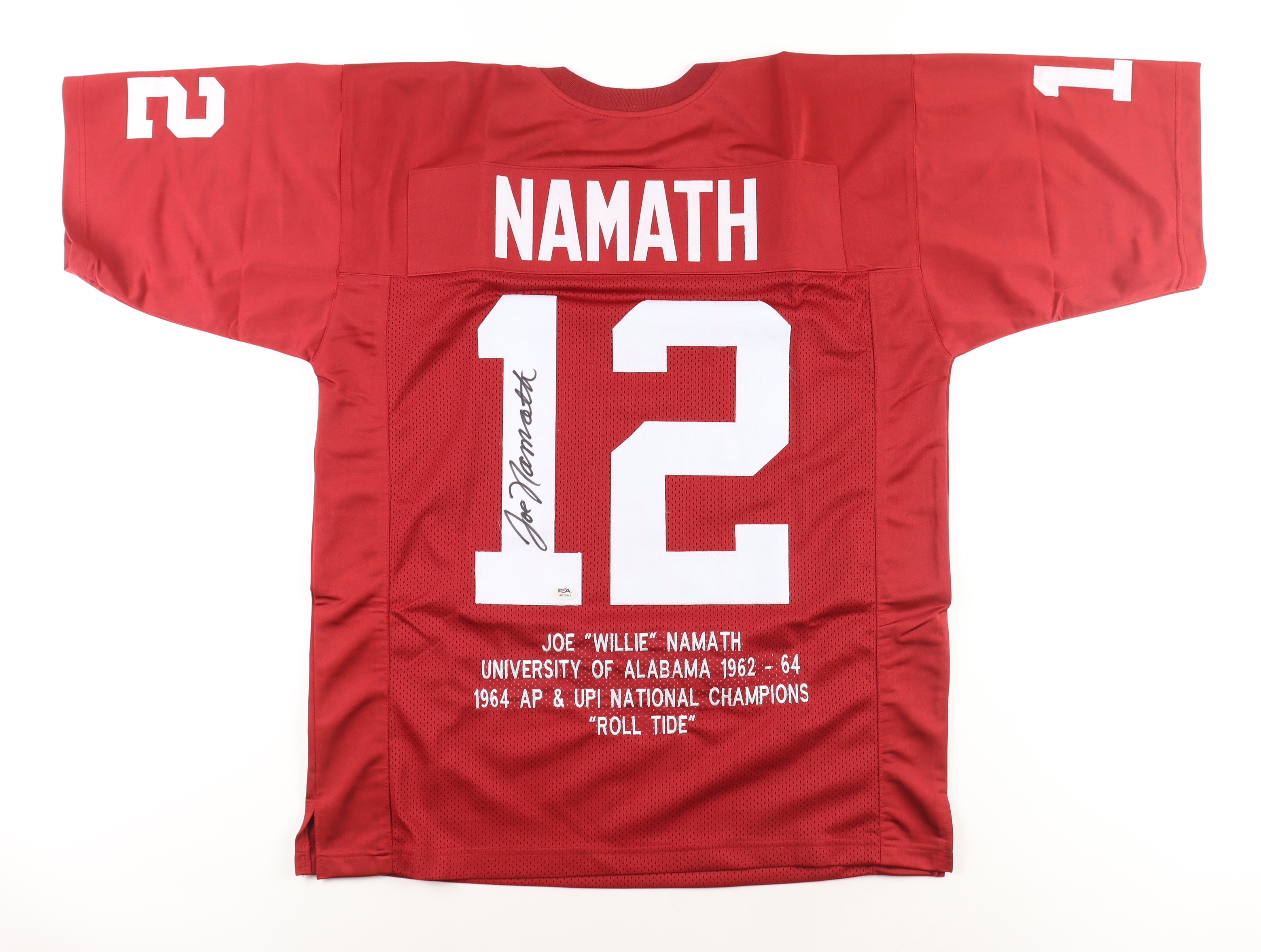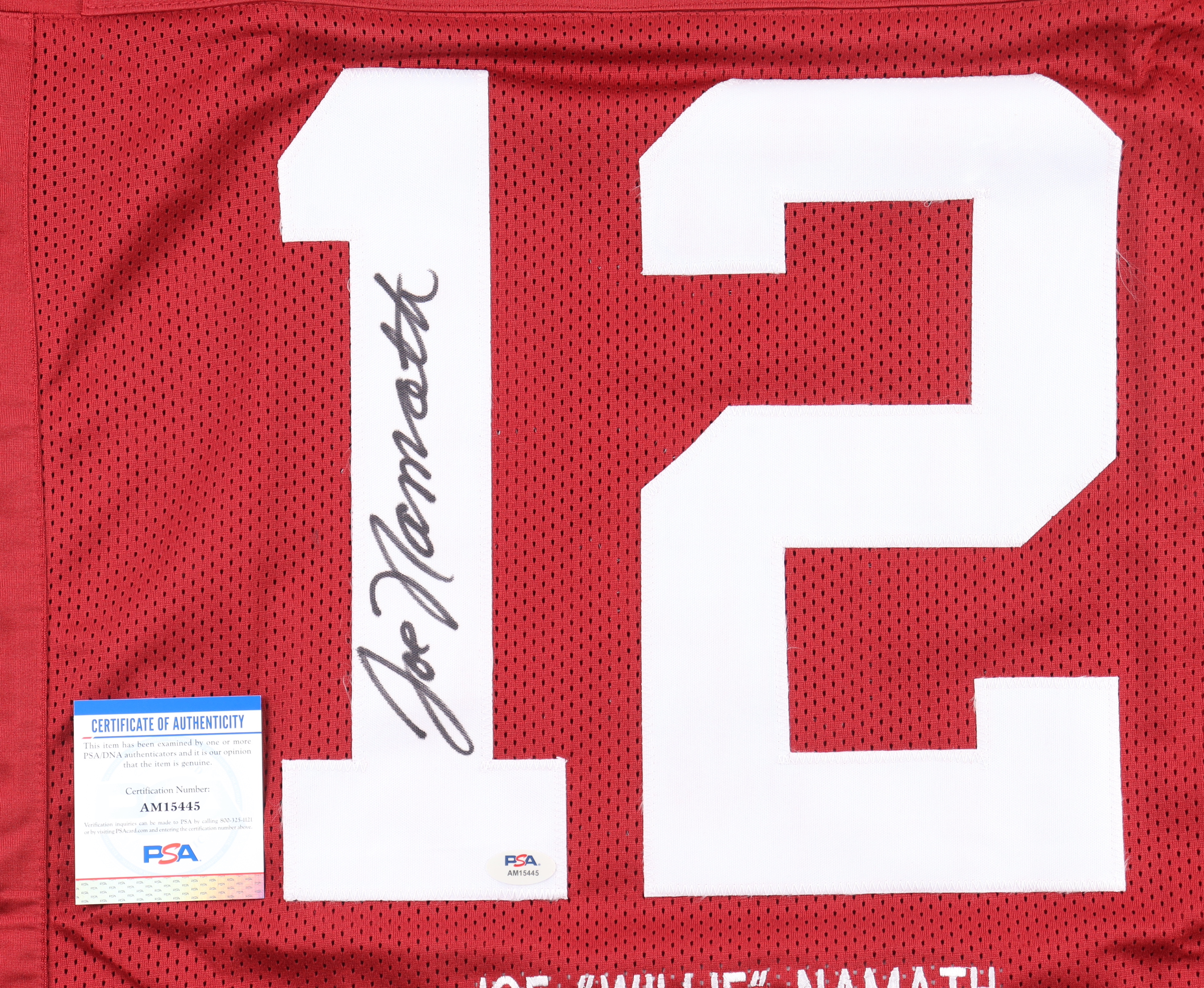 Custom jersey with everything sewn on, size XL. Hand-signed by Joe Namath (HOF). Namath's career stats has been sewn on below the reverse numbers.