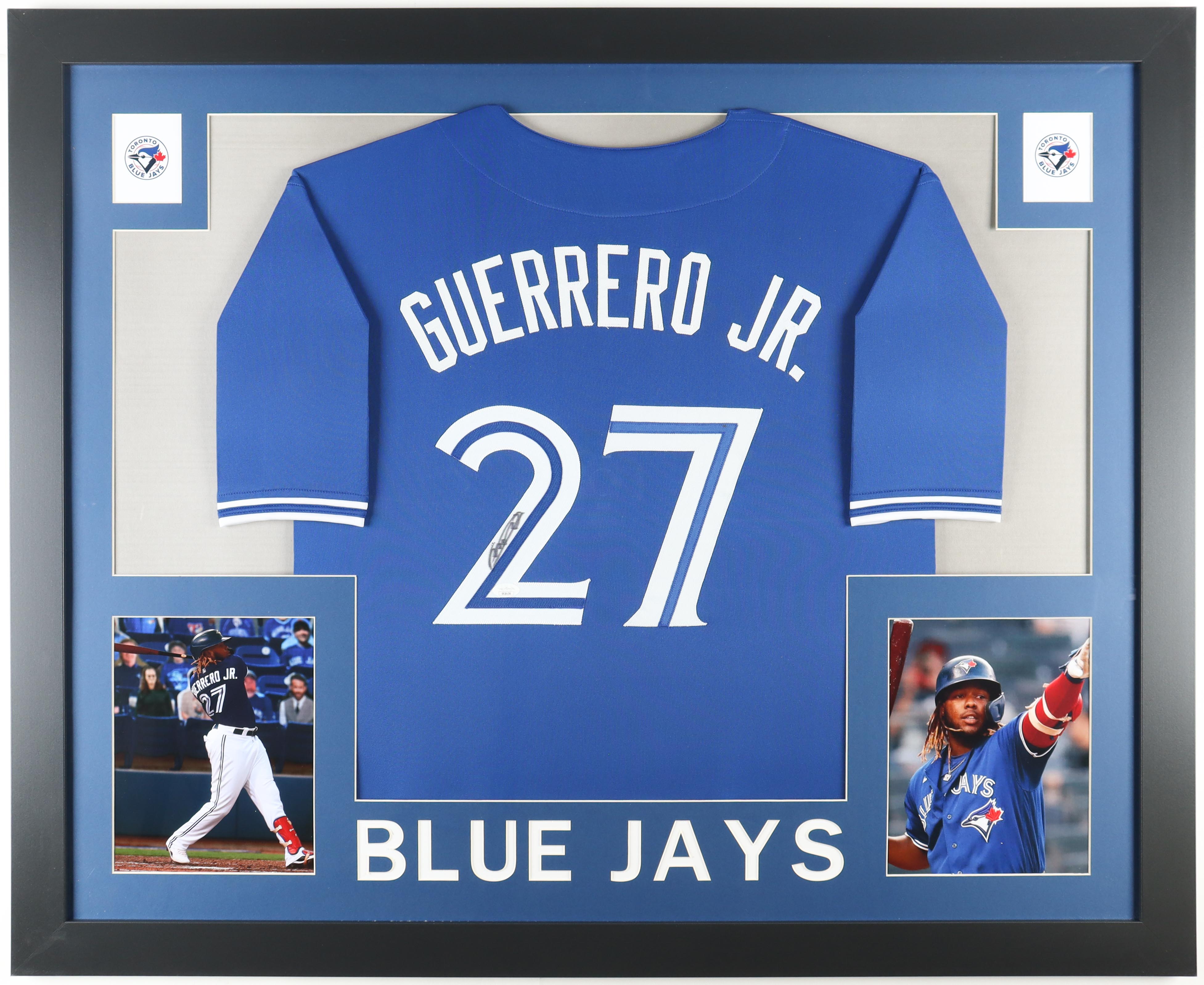 Custom frame measures 35.5" x 43.5" in size and features a jersey hand-signed by Vladimir Guerrero Jr.