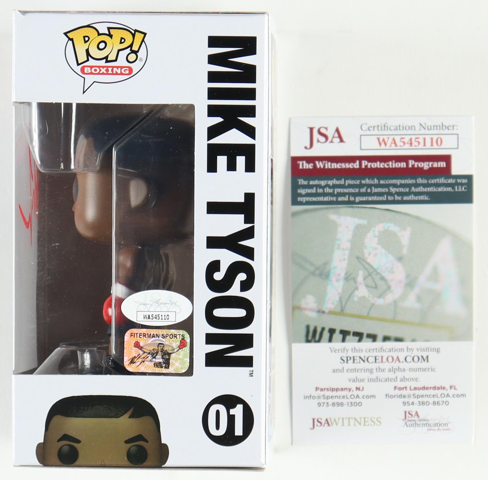 The lot / autograph(s) includes an official Mike Tyson Fiterman Sports hologram, as well as an official James Spence Authentication (JSA) hologram and matching COA for authenticity purposes. The signing of this item was witnessed by JSA.