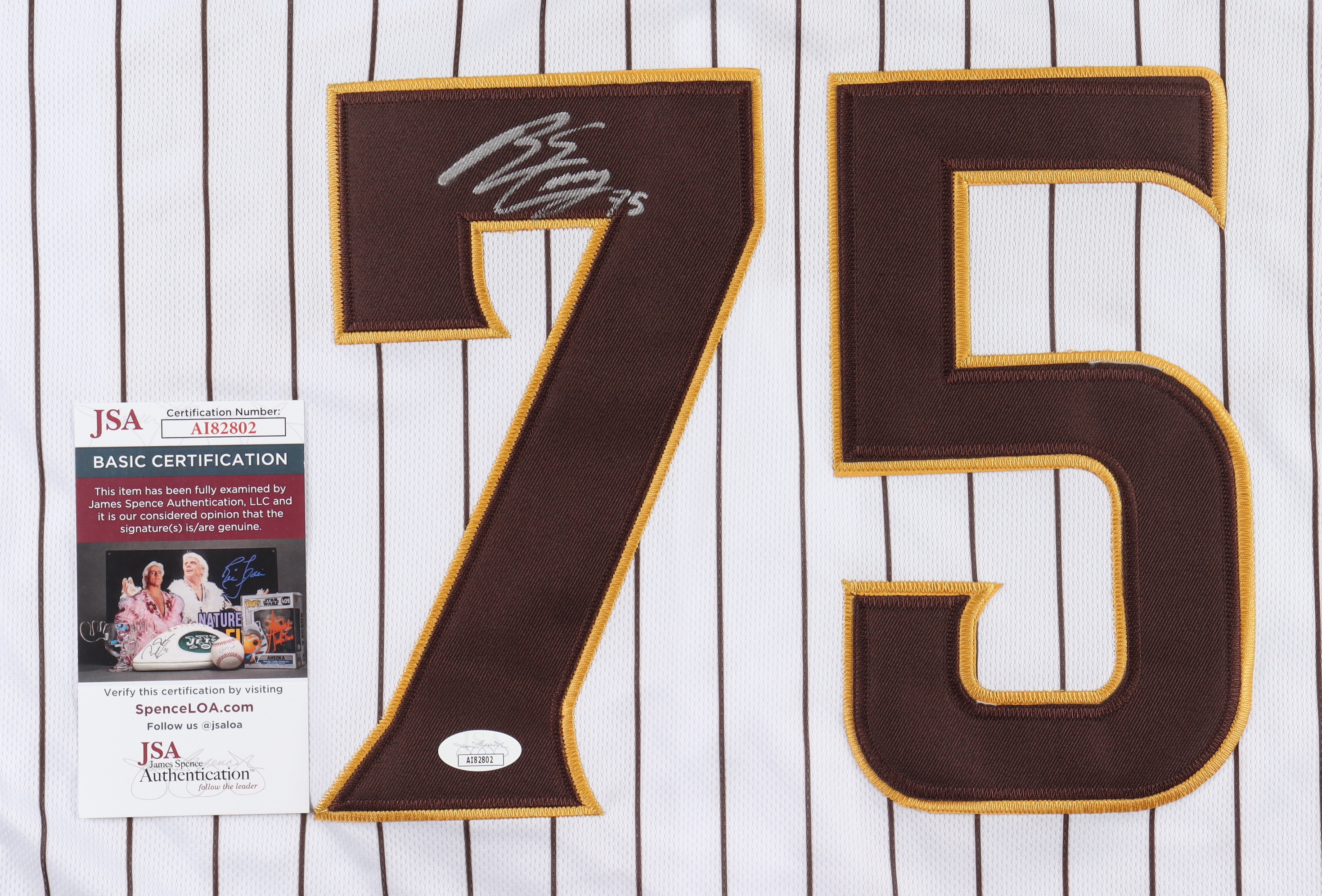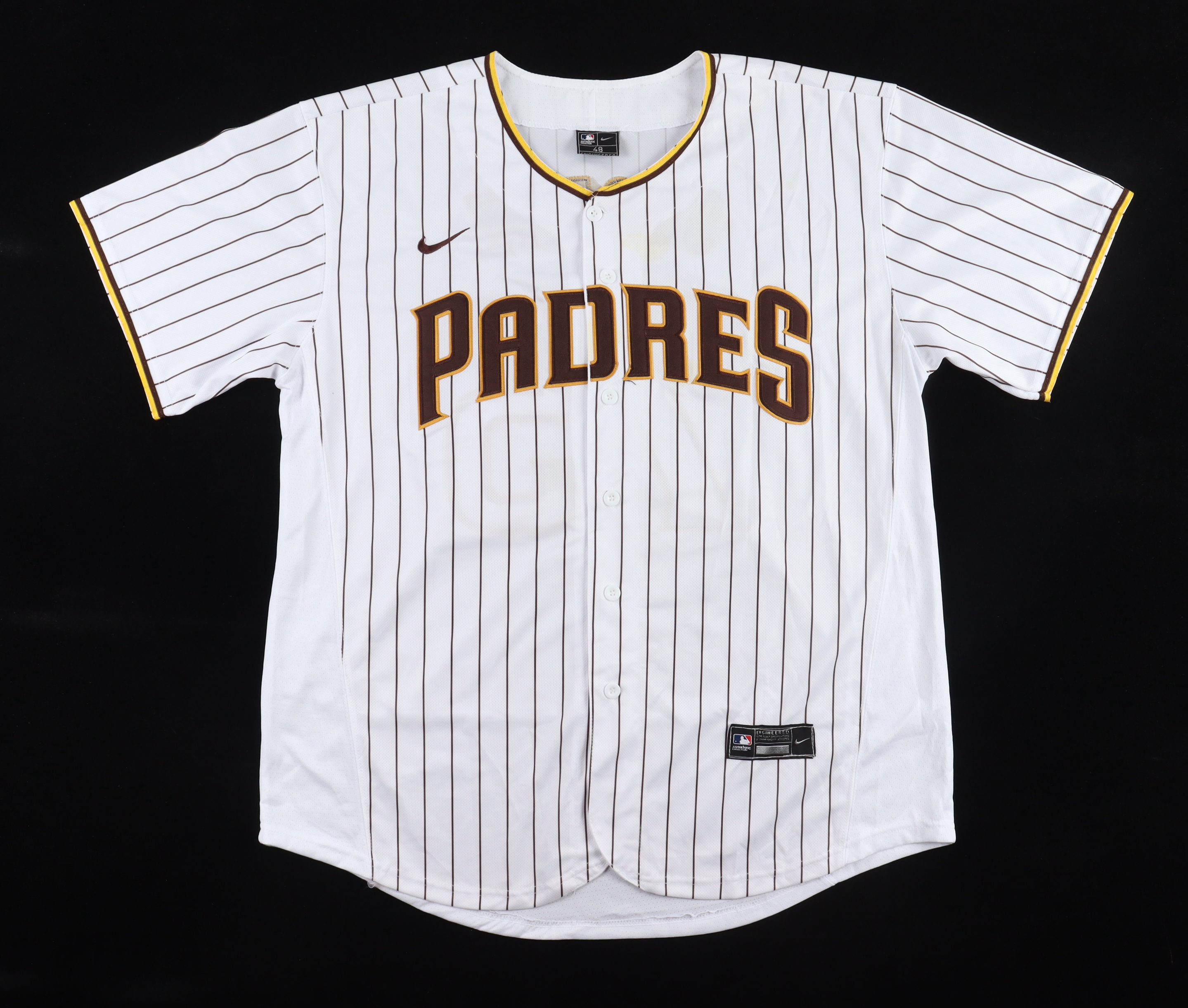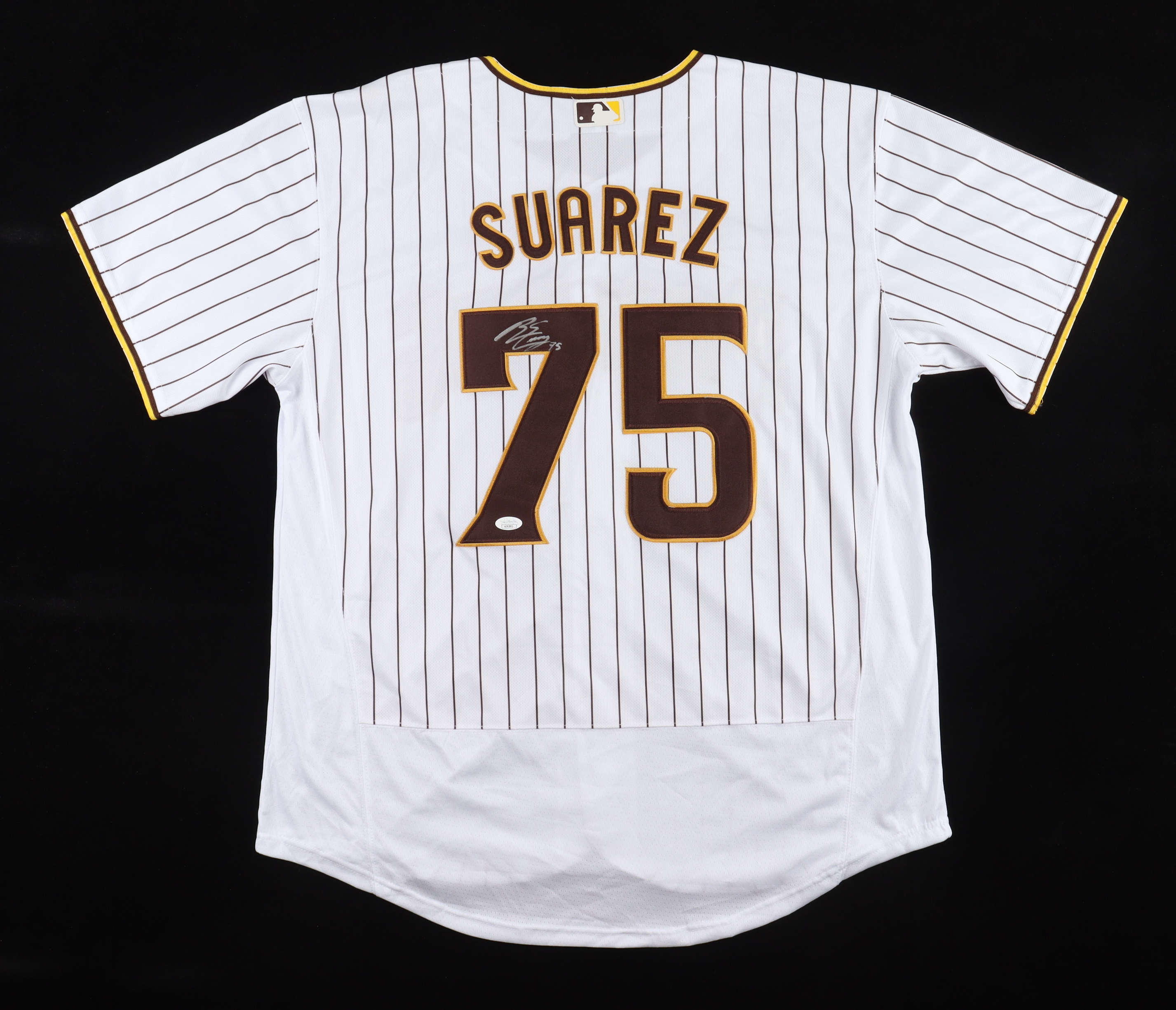 Nike jersey with everything sewn on, size 48. Hand-signed by Robert Suarez (San Diego Padres).