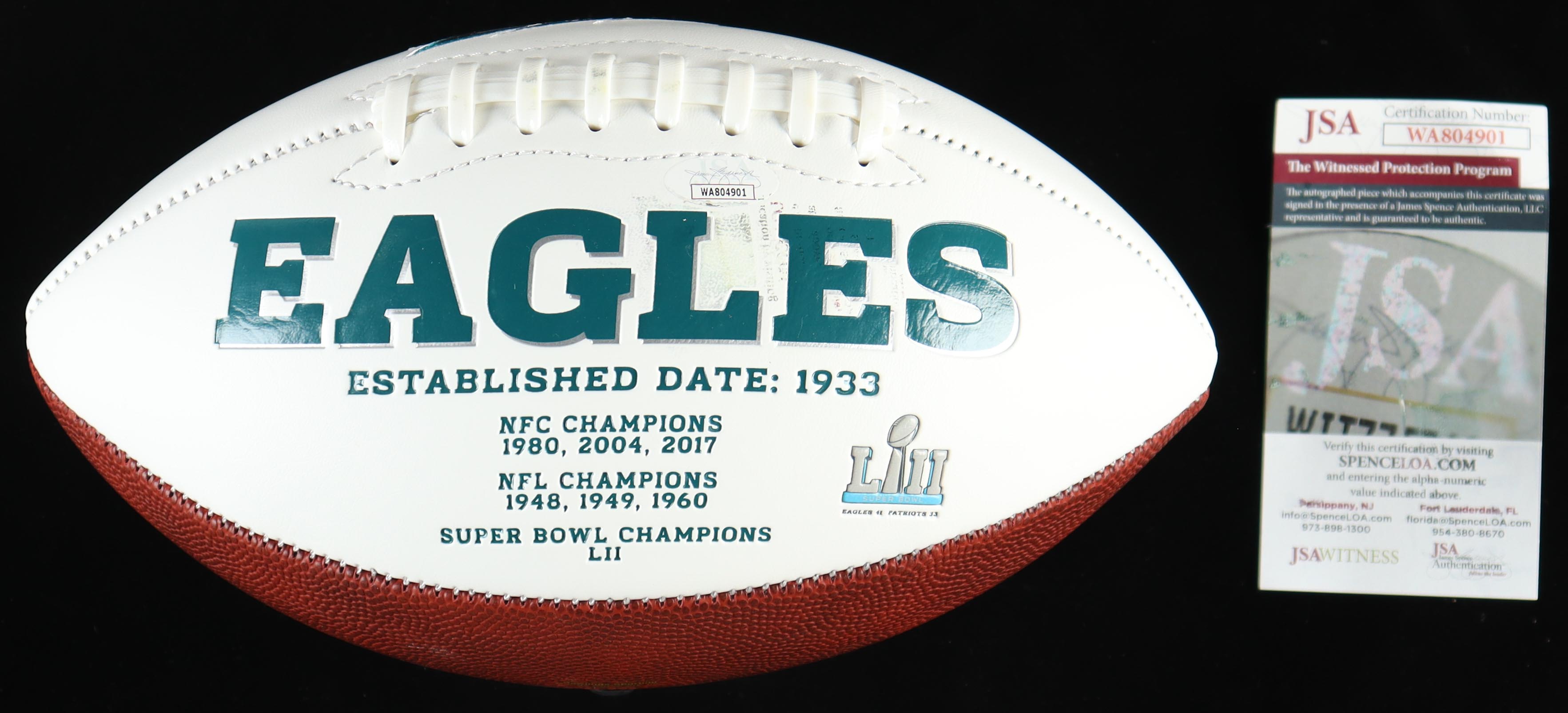 Philadelphia Eagles logo football. Hand-signed by Michael Vick. Please note, the ink from the COA has bled onto the football.