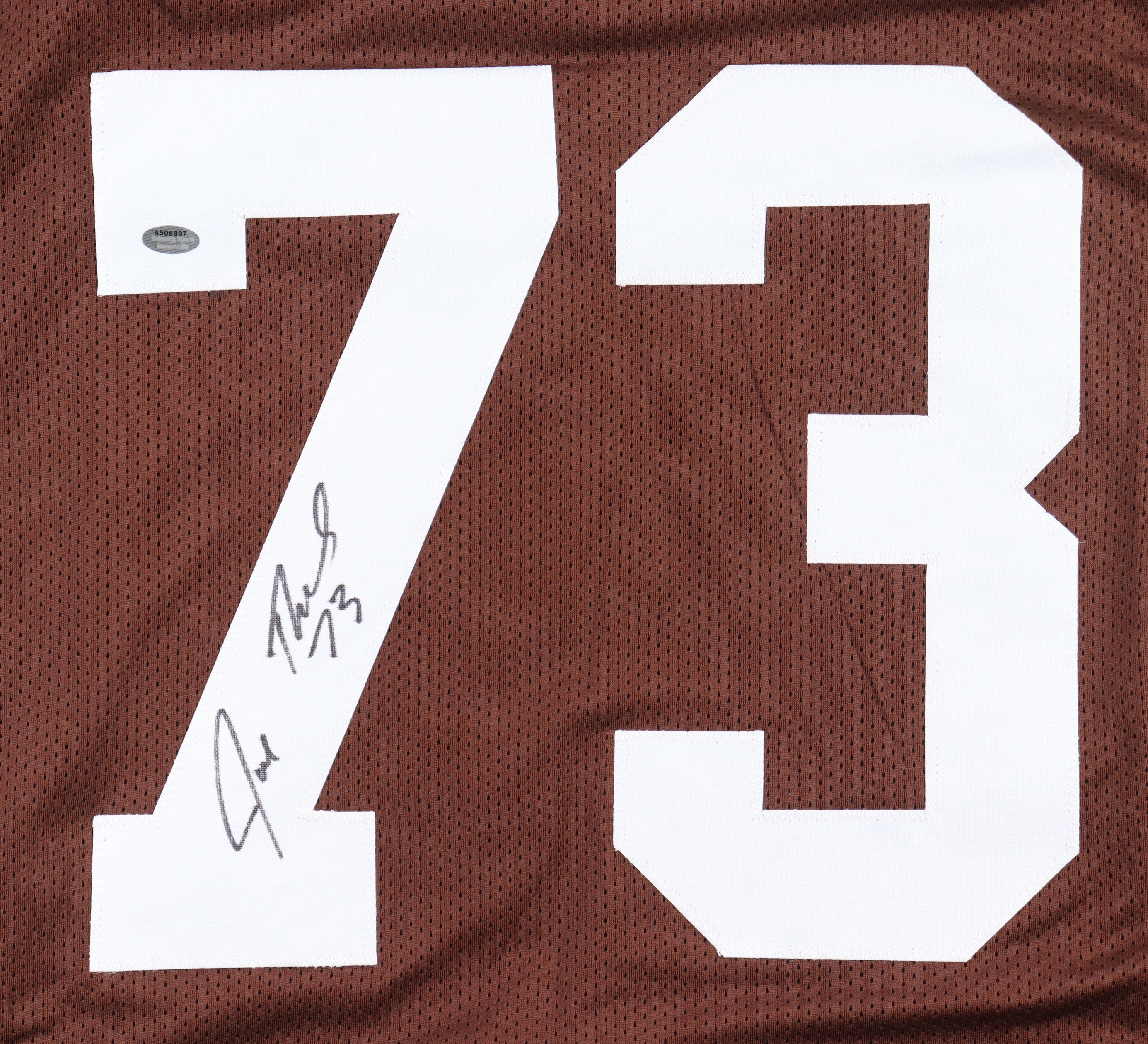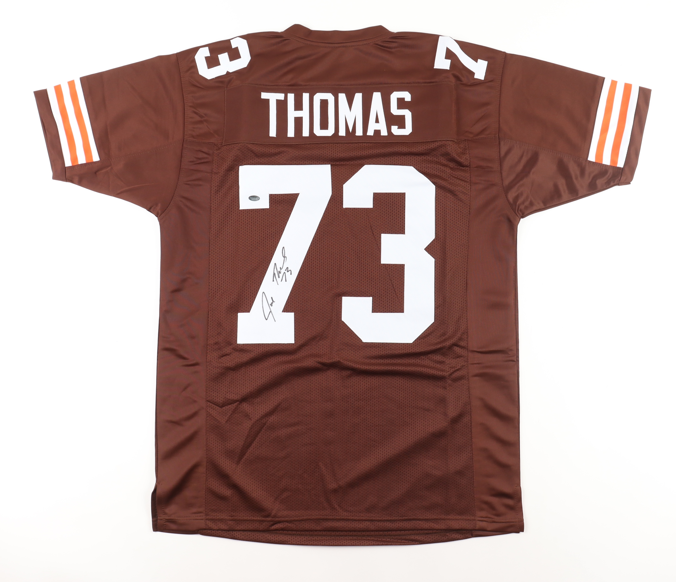Custom jersey. Everything sewn on, size XL. Hand-signed by Joe Thomas (HOF).
