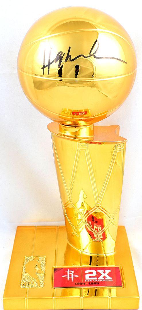 Replica trophy measures 12" tall and has been hand-signed by Hakeem Olajuwon (Houston Rockets, HOF).