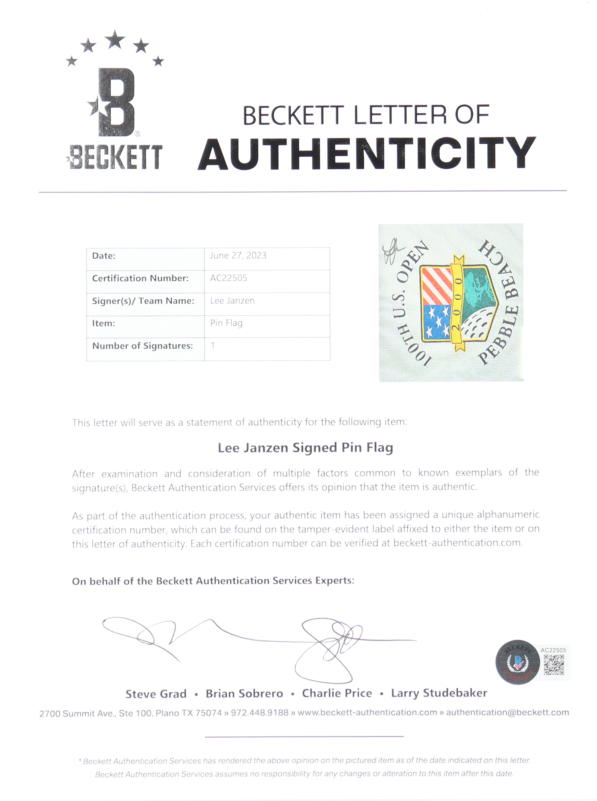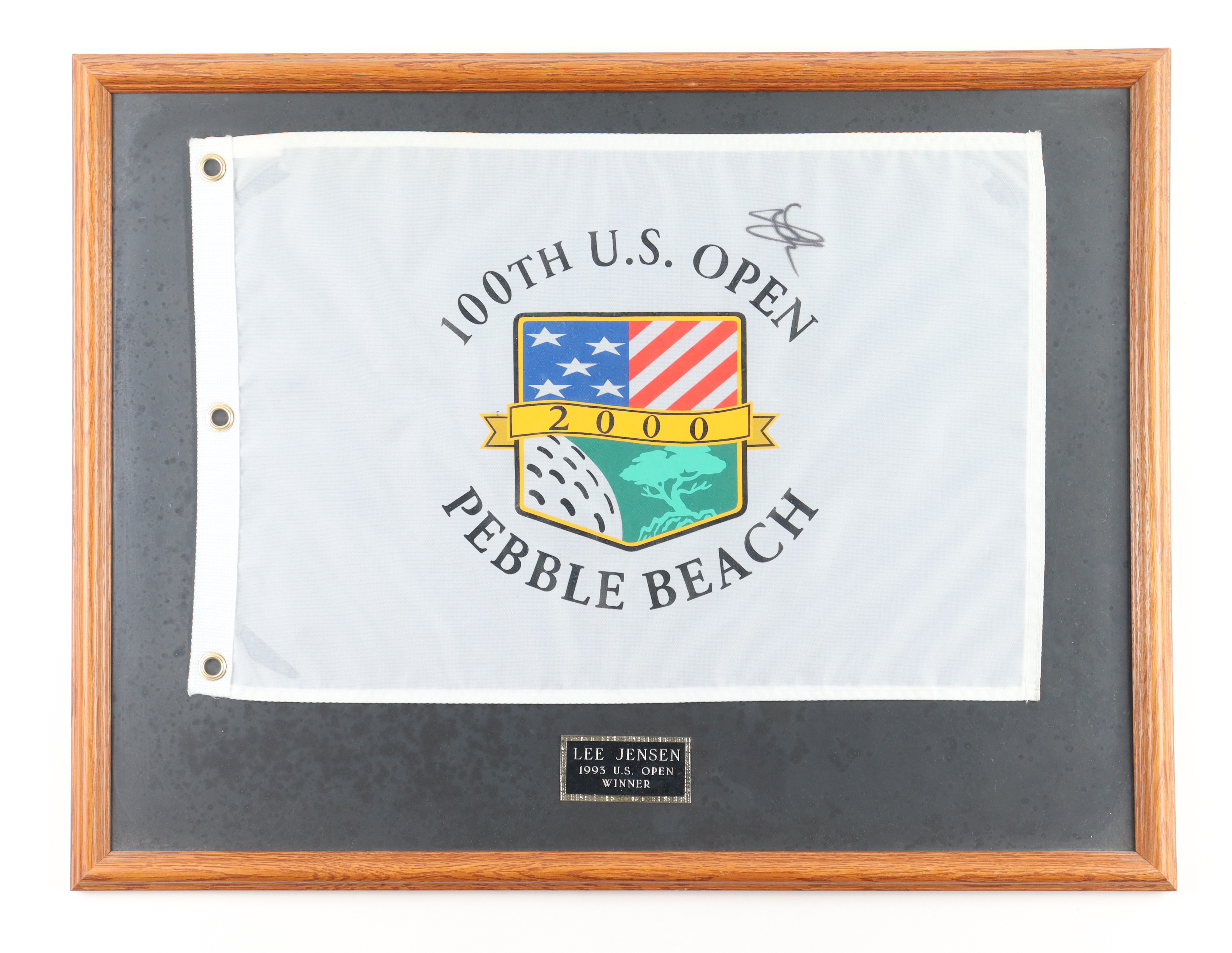 Custom fame measures 19" x 25" in size and features a 100th U.S. Open Golf Pin Flag that has been hand singed by Lee Janzen