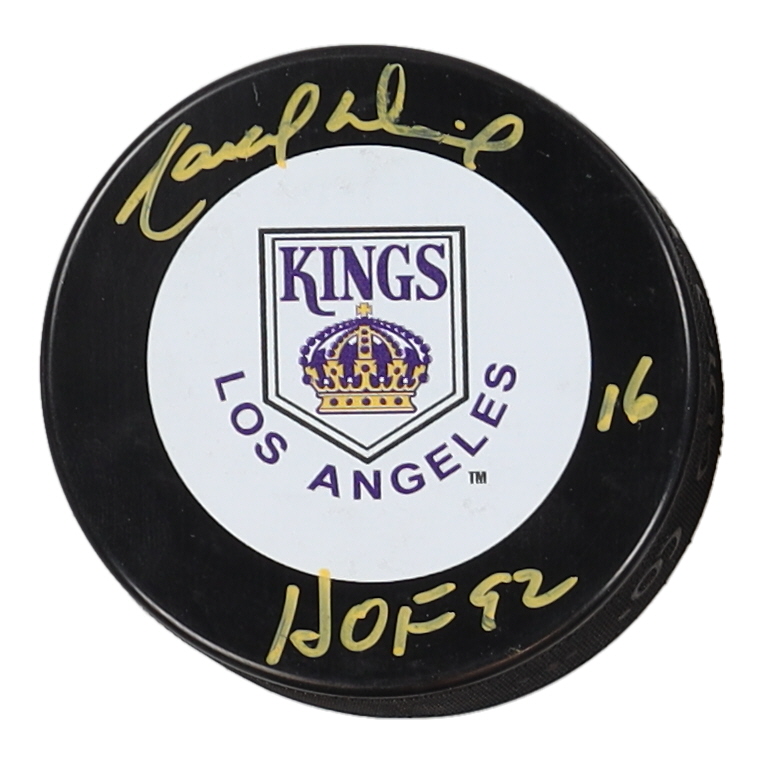 Los Angeles Kings logo hockey puck. Hand-signed and inscribed by Marcel Dionne (HOF).