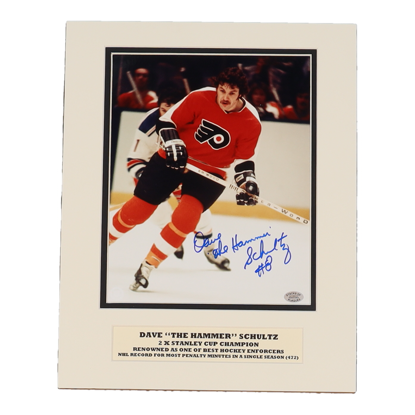 Custom mat measures 11" x 14" in size and features a photo that has been hand-signed by Dave "The Hammer" Schultz (Philadelphia Flyers).