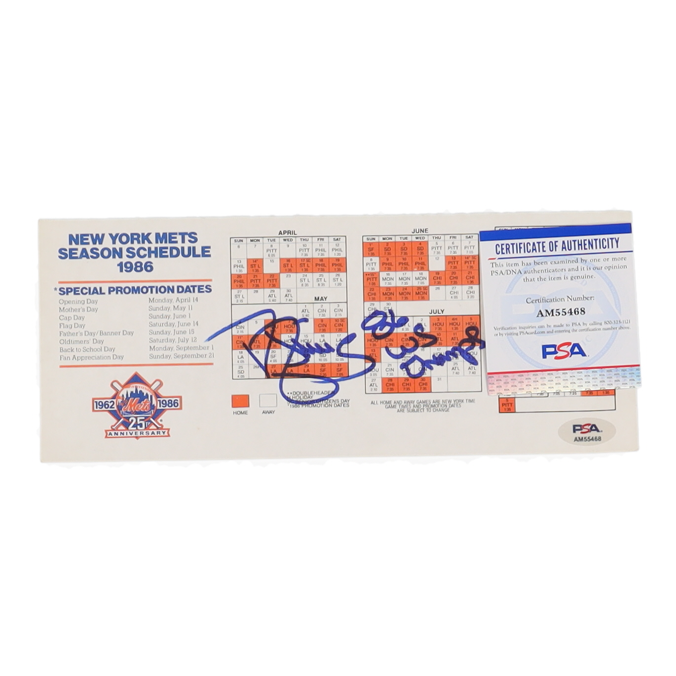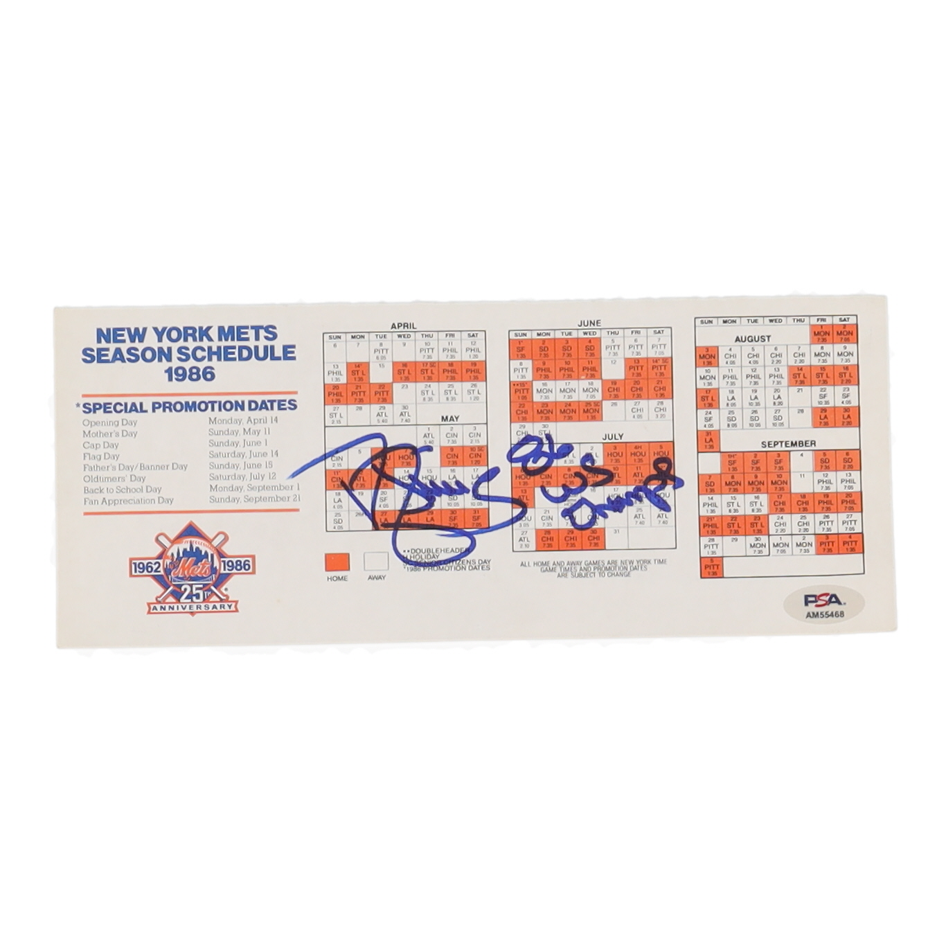 1986 New York Mets Season schedule has been hand-signed and inscribed by Darryl Strawberry.