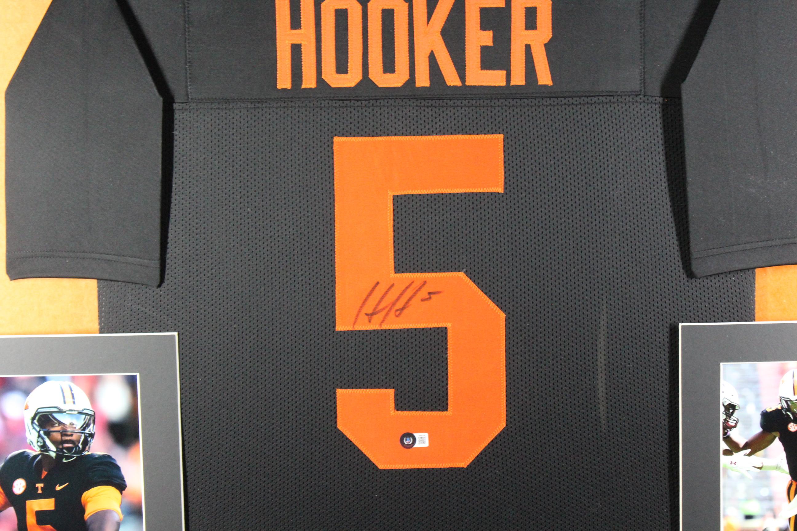 Custom frame measures approximately 35" x 43" in size and features a jersey that has been hand-signed by Hendon Hooker.