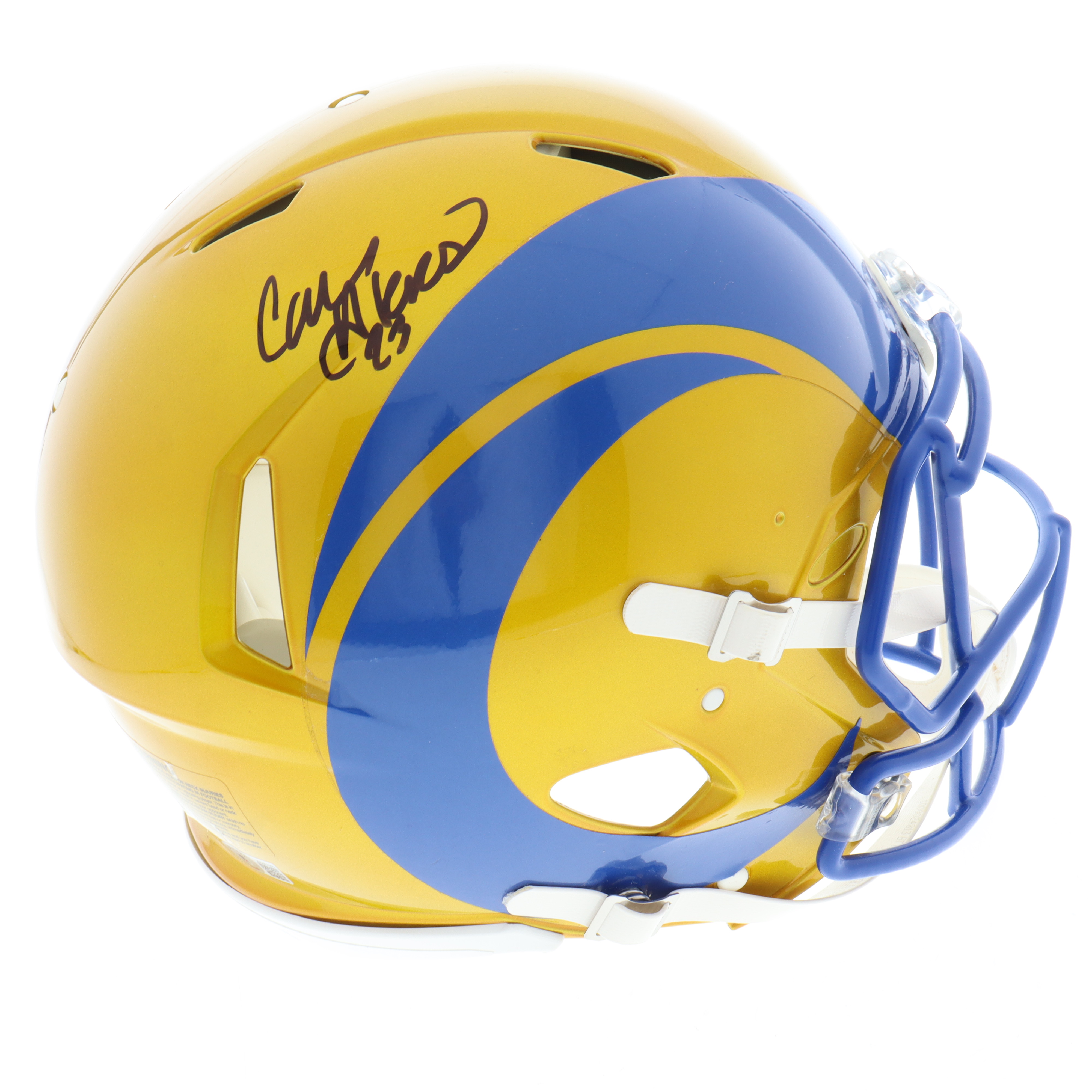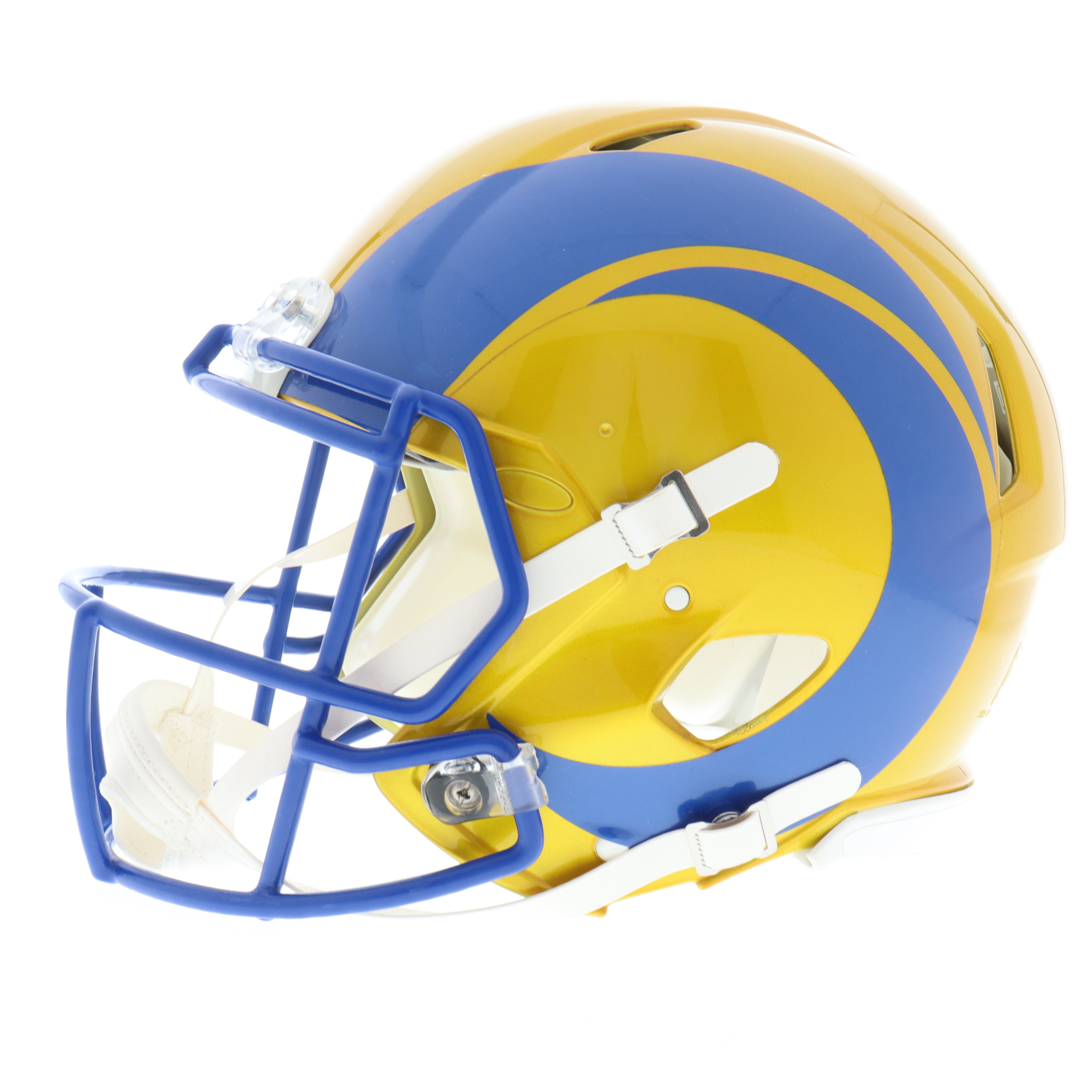 Riddell Los Angeles Rams full-size authentic on-field Flash Alternate Speed helmet. Hand-signed by Cam Akers.