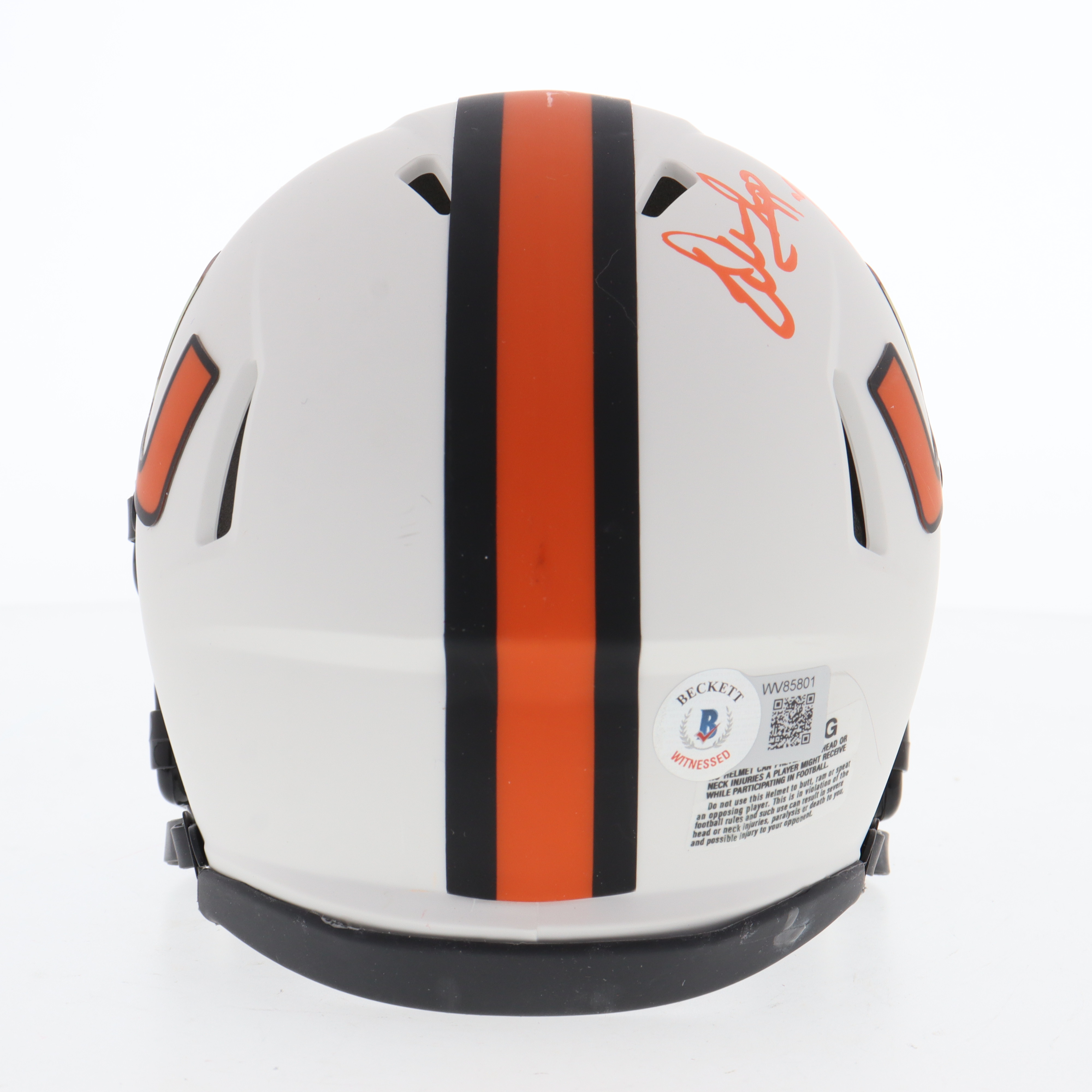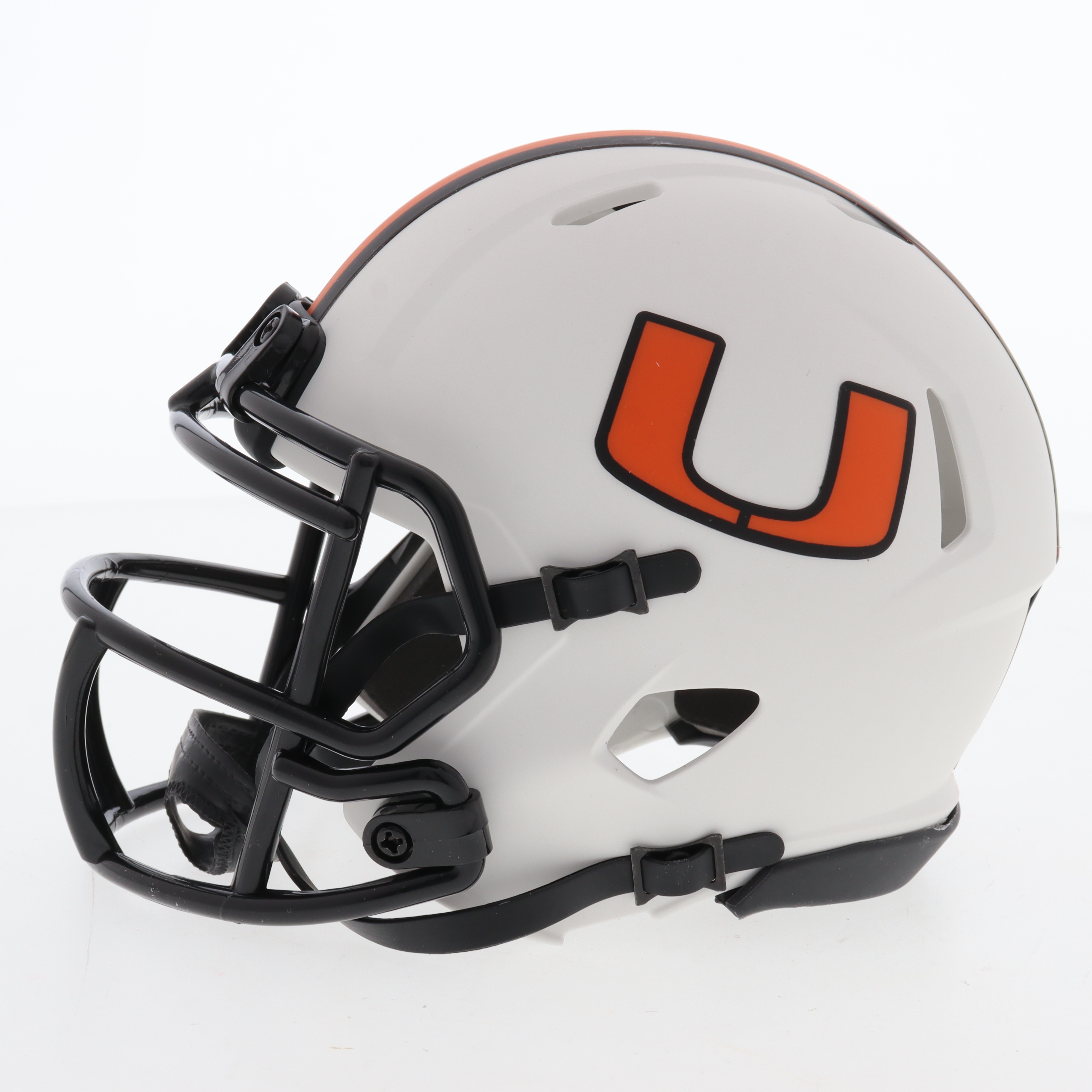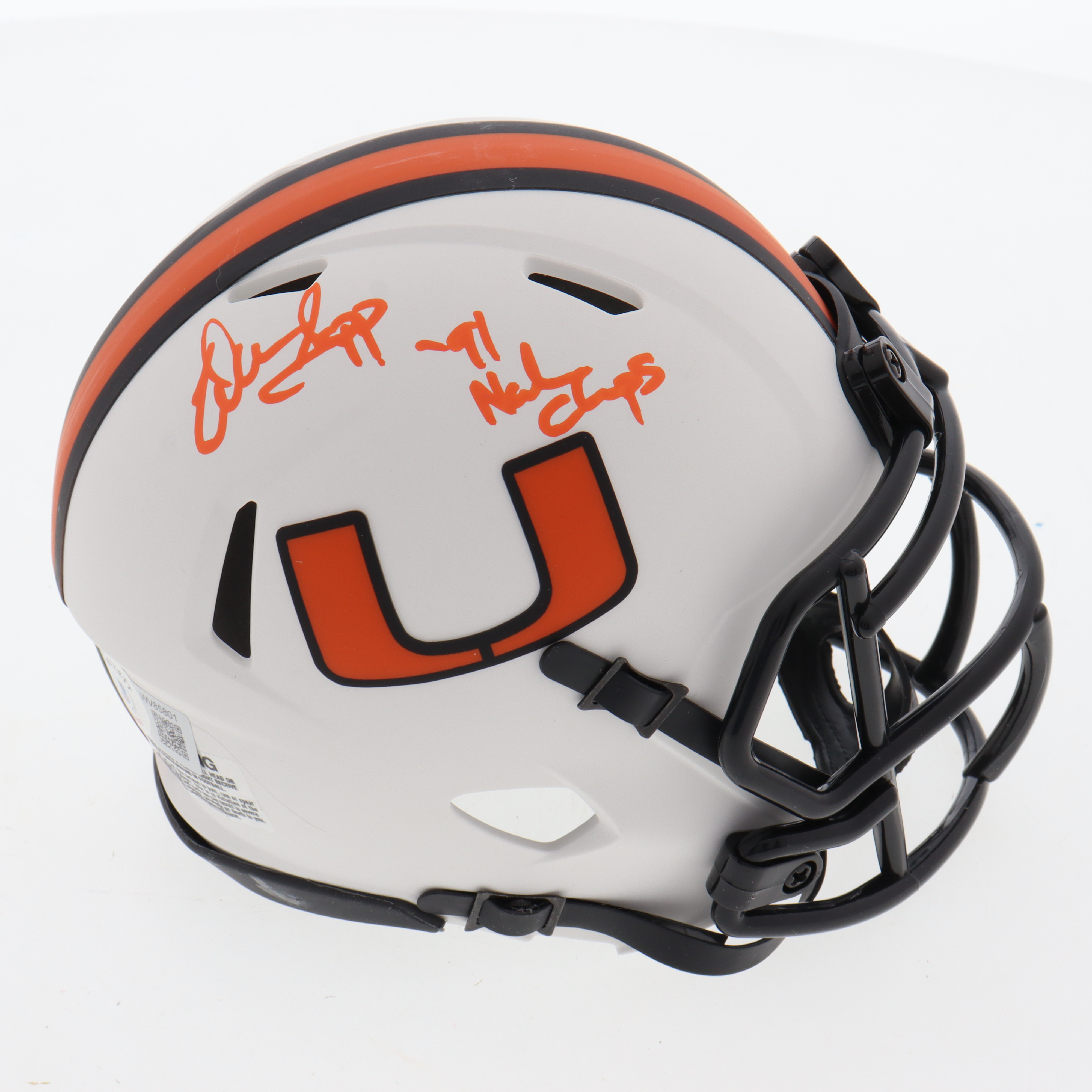 Riddell Miami Hurricanes Lunar Eclipse Alternate Speed mini helmet. Hand-signed and inscribed by Warren Sapp.
