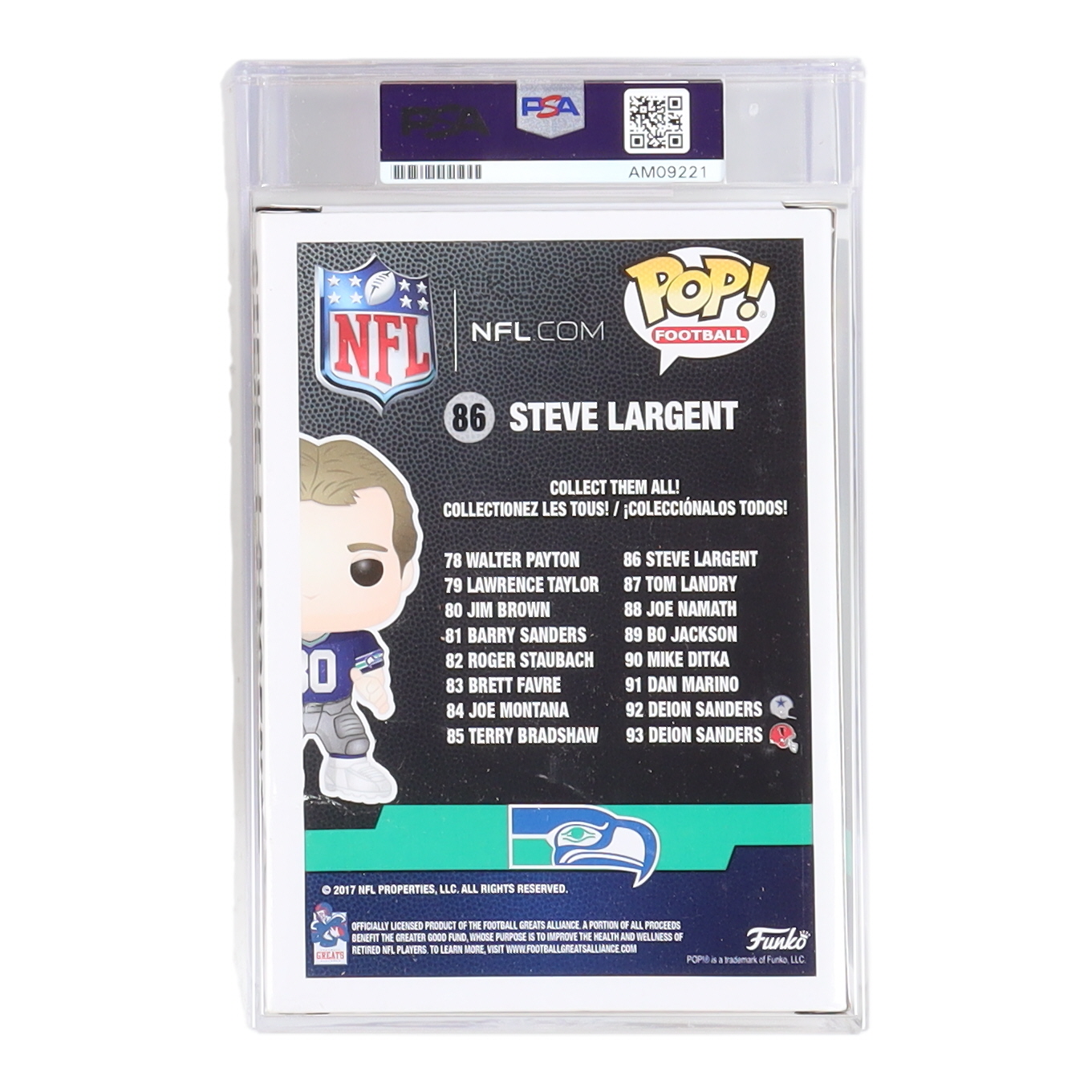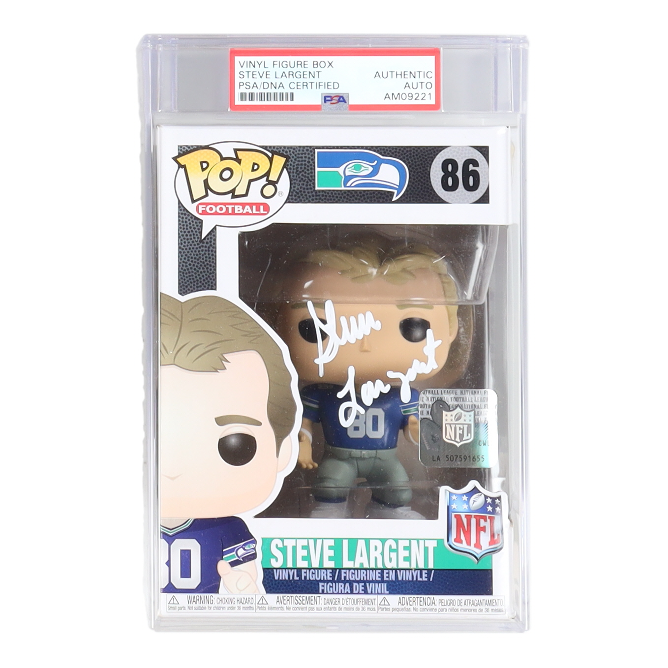 Funko Pop! figure measures approximately 4" tall and has been hand-signed on the packaging by Steve Largent (Seattle Seahawks, HOF).