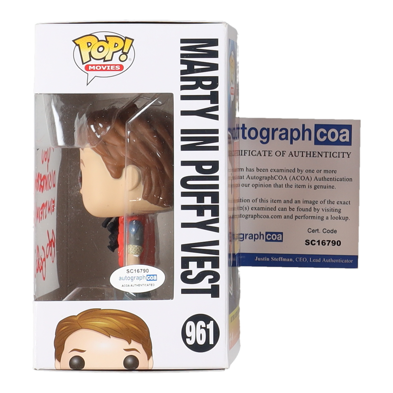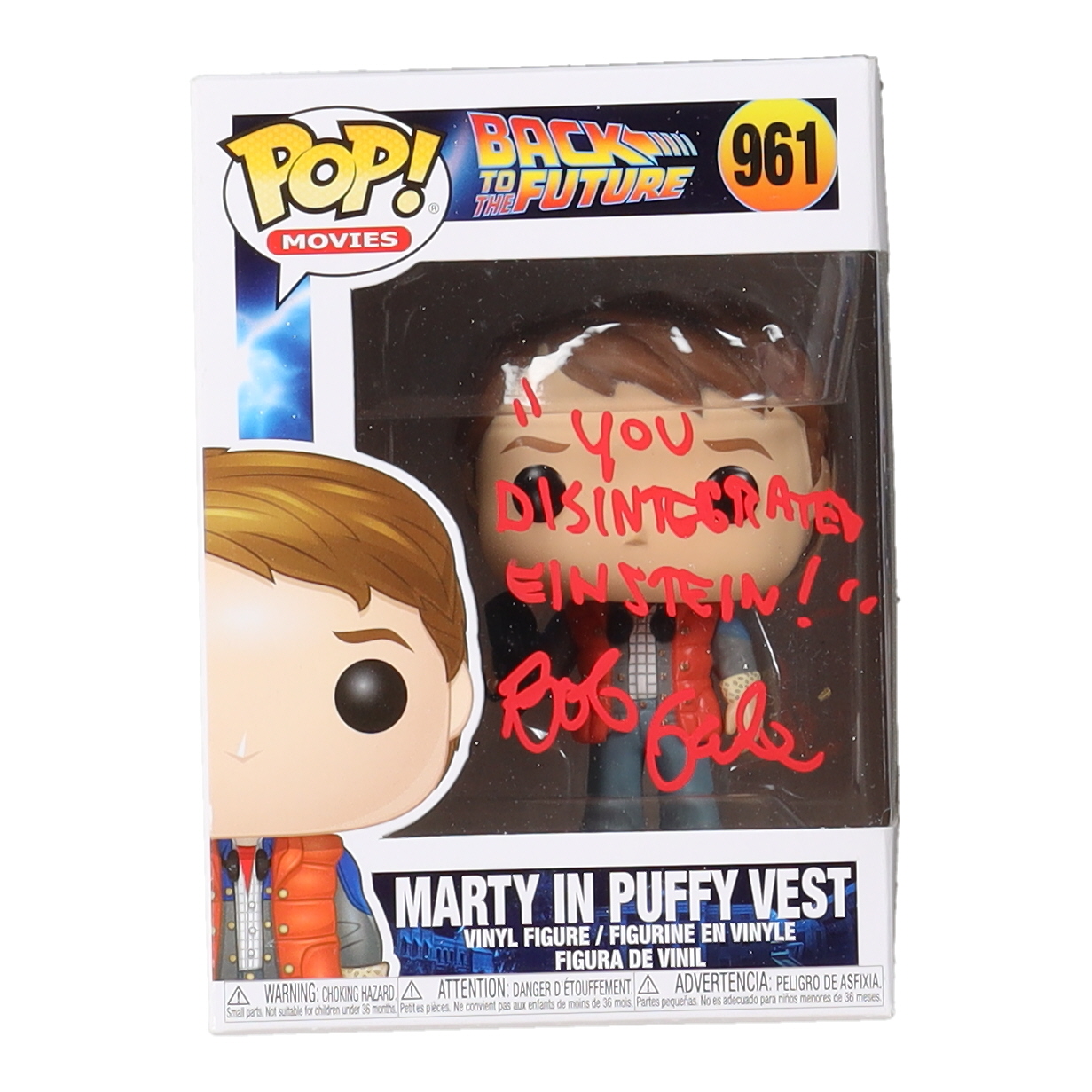 Bob Gale Signed "Back to the Future" #961 Marty In Puffy Vest Funko Pop! Vinyl Figure Inscribed "You Disintegrated Einstein!" (AutographCOA)