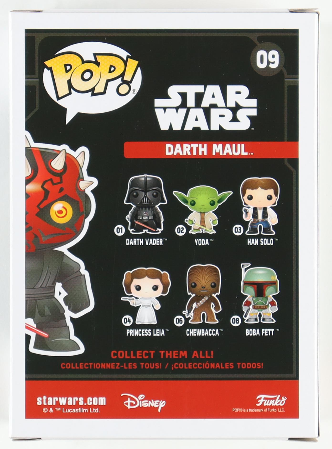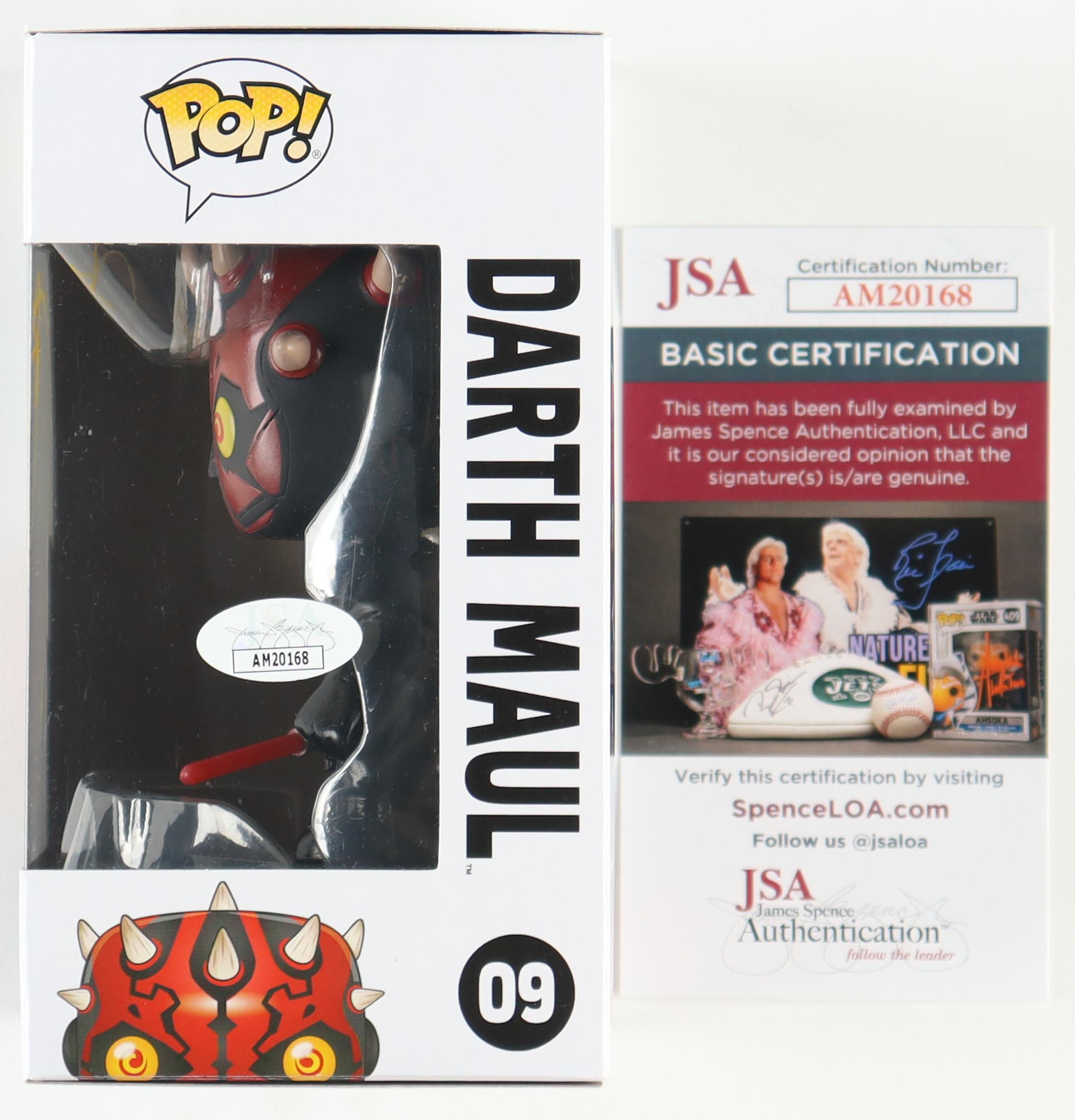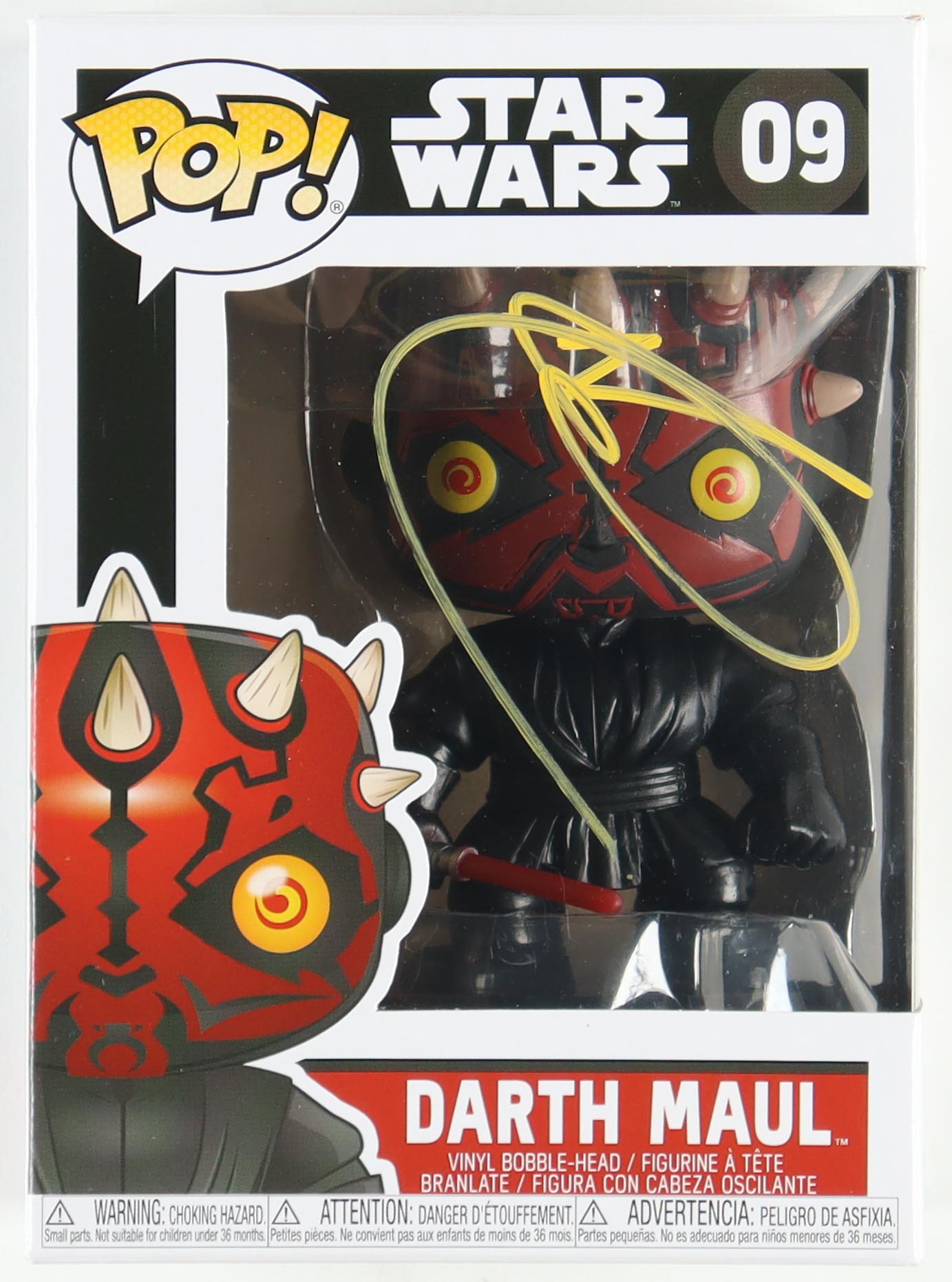 Funko Pop! vinyl figure measures approximately 4" tall and has been hand-signed on the packaging by Ray Park (Darth Maul).