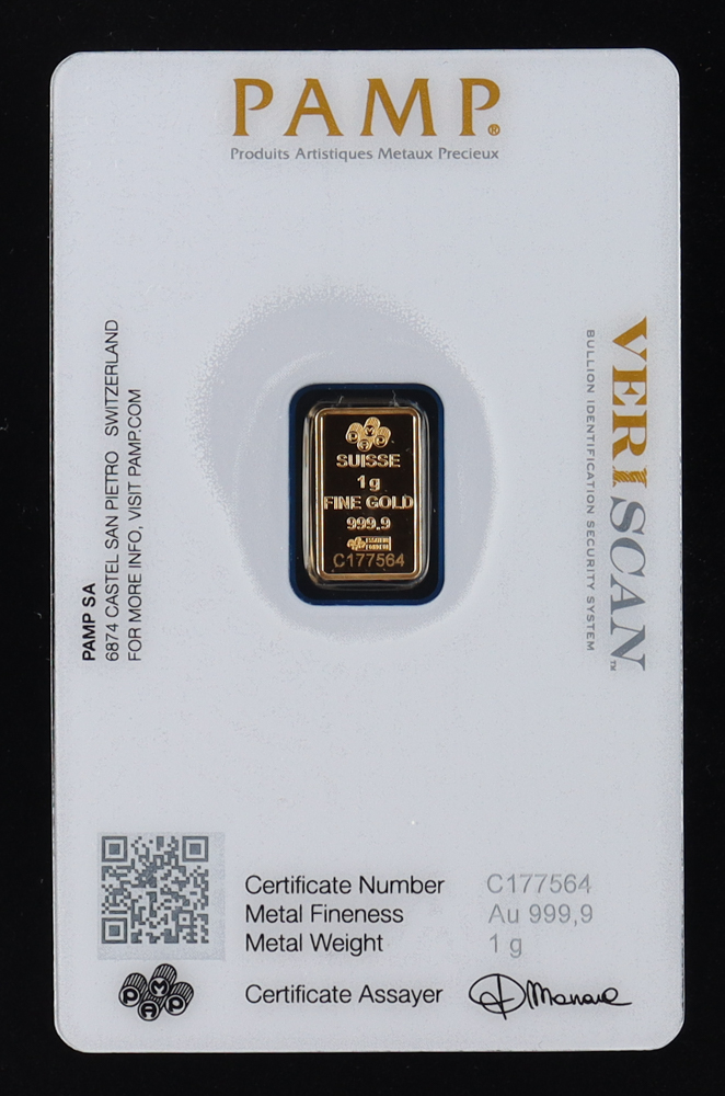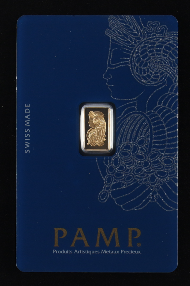 PAMP Suisse 1g 999.9 Fine Gold Lady Fortuna Bar in Assay