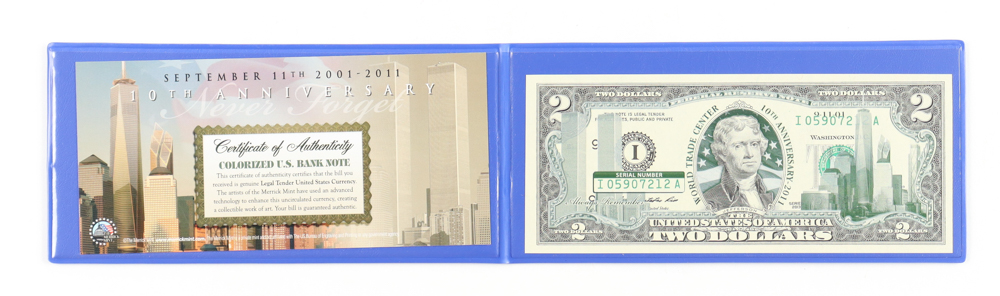 September 11th Legal Tender Colorized U.S. $2.00 Two Dollar Bill Commemorative Bank Note with Folder