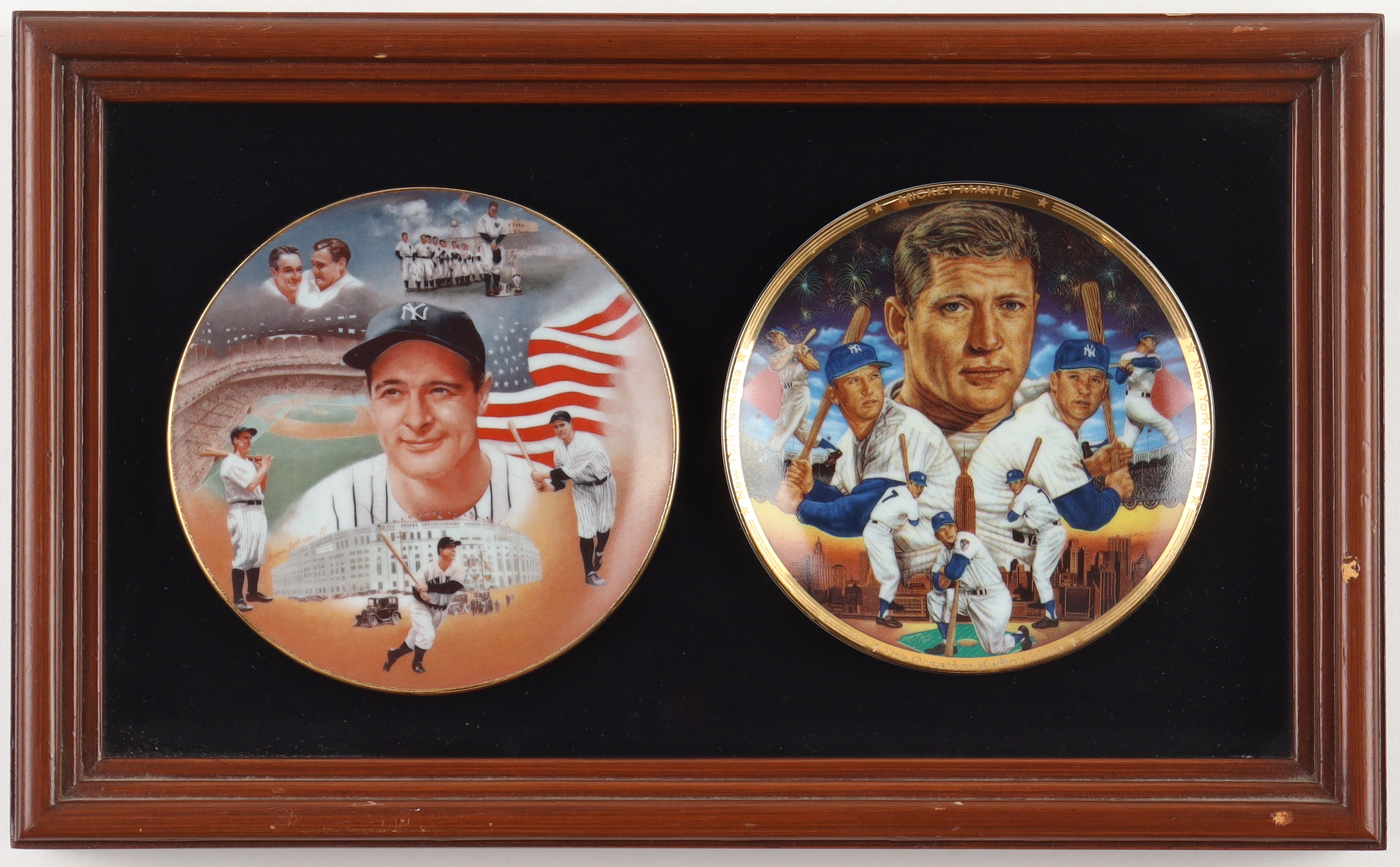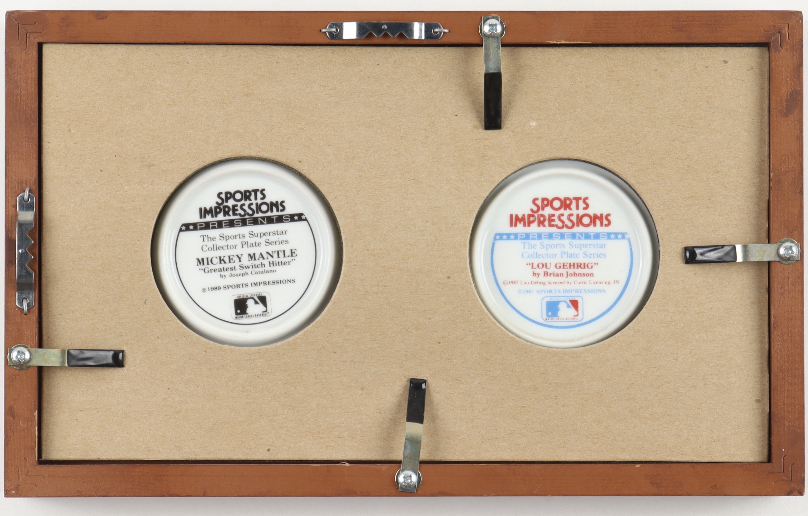 Custom frame measures approximately 7" x 11.5" in size and features (2) Sports Impressions Collector Plates depicting Mickey Mantle (D. 1995, New York Yankees, HOF) and Lou Gehrig (D. 1941, New York Yankees, HOF). Please note, there is scuffing on the frame.