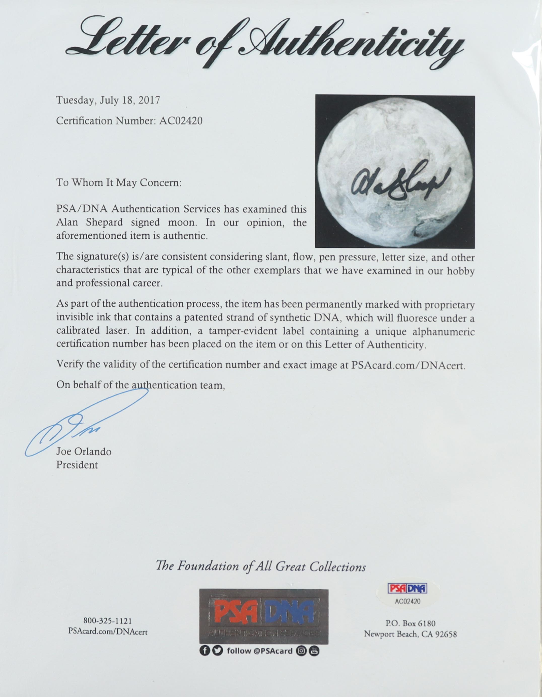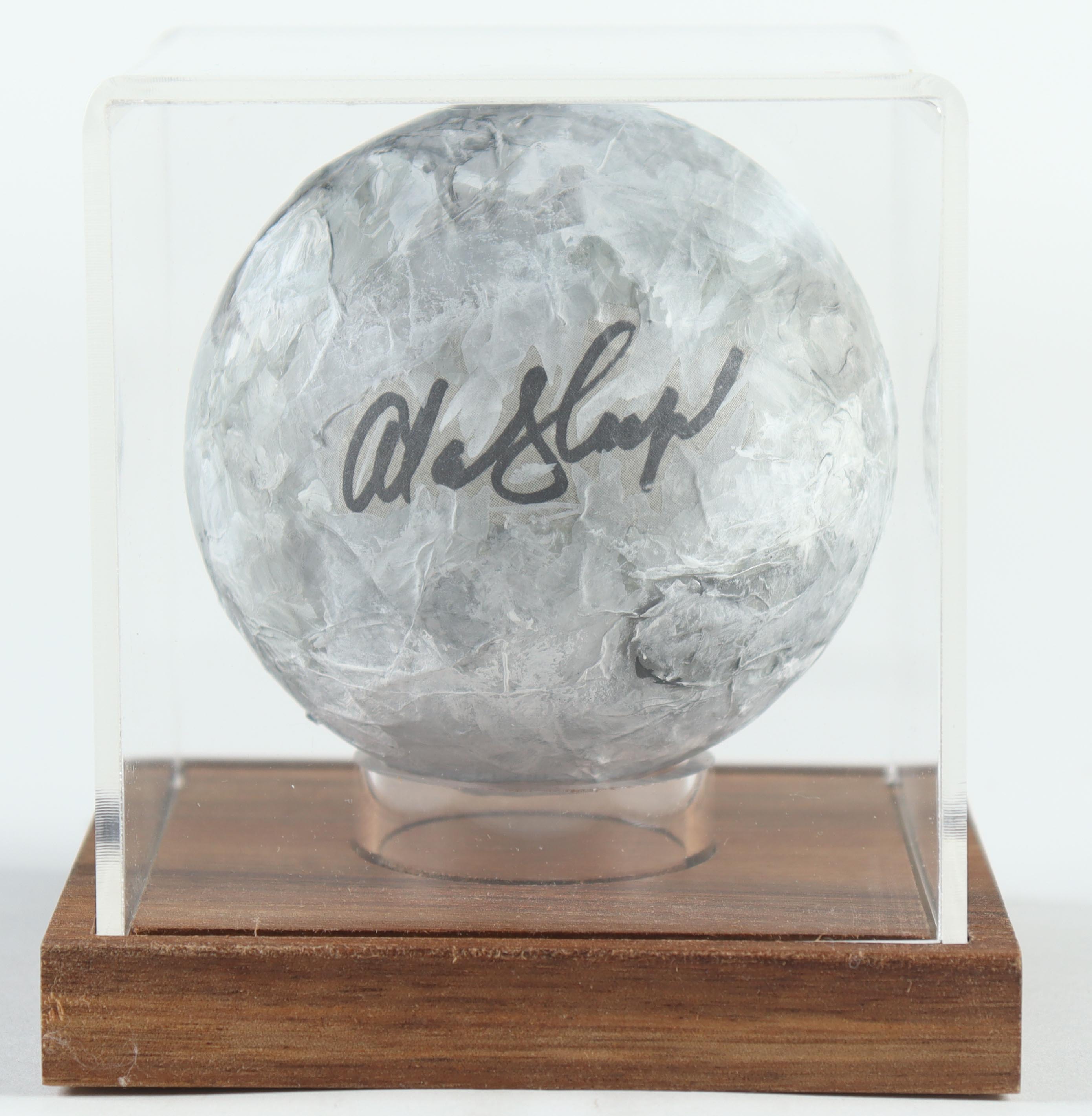 Replica moon rock has been hand-signed by Alan Shepard (D. 1998). Includes display case as shown.